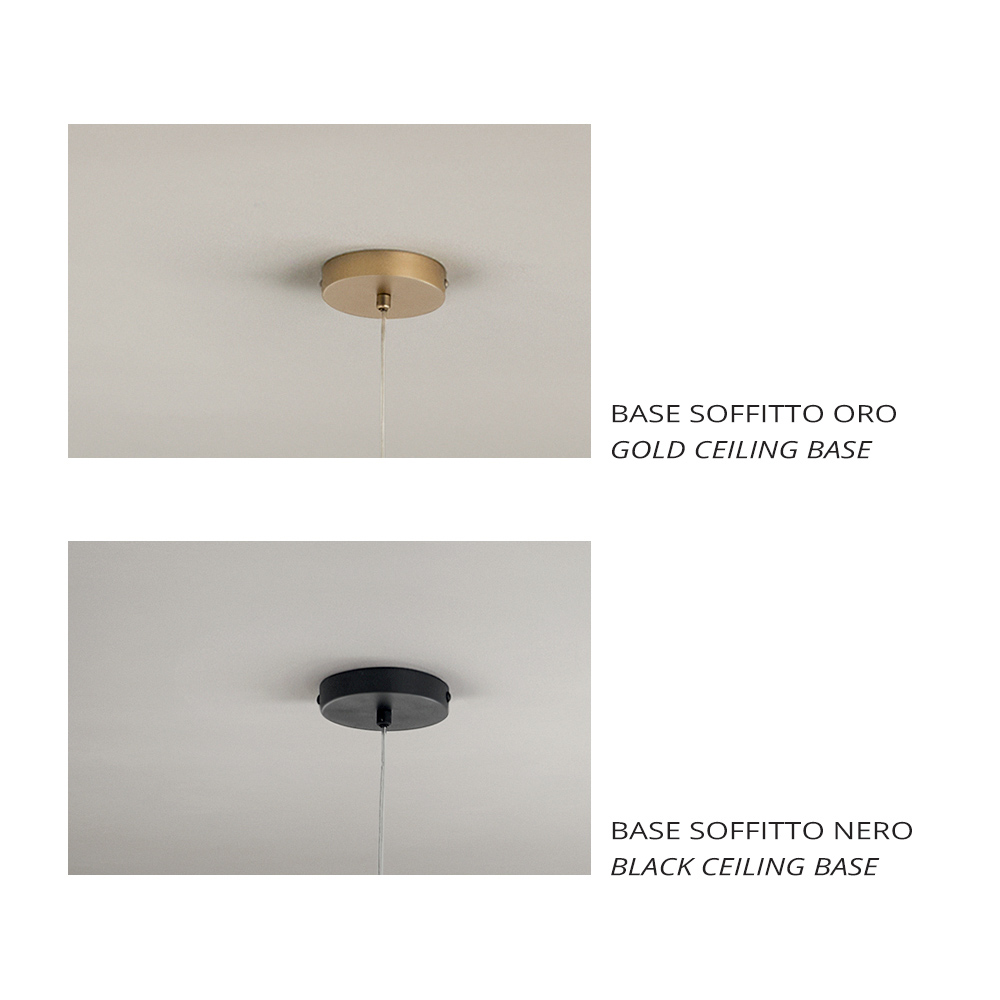 Lampe mit Metall -Deckensockel und Diffusor aus geblasenem Glas , gekennzeichnet durch eine Doppelschicht: innen aus satiniertem Glas und außen aus farbigem Glas . Kappe aus Polymermaterial zur Stabilisierung des Kabels in einer zentralen Position. Verstellbares Kabel.