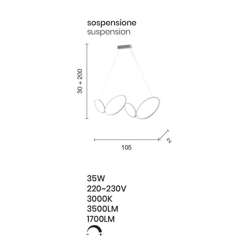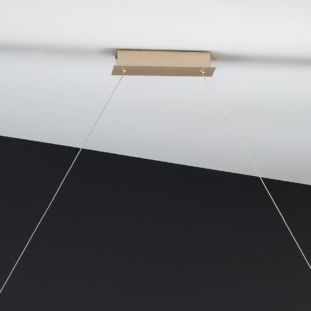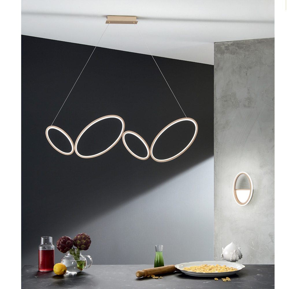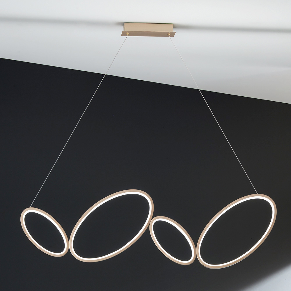 Pendelleuchte mit goldfarbener Metallstruktur und Acryl- und Silikondiffusor komplett mit dimmbarer LED-Lichtquelle . Eine moderne und exklusive Ästhetik, die sich durch die Verwendung von ovalen Formen unterschiedlicher Größe auszeichnet, um ein raffiniertes und innovatives Design zum Leben zu erwecken, das in Wohnräumen wie Esszimmer, Küche, Wohnzimmer oder Schlafzimmer den Mittelpunkt der Aufmerksamkeit erobern kann. Bett mit modernen Möbeln. Das wunderschöne goldene Finish, das die gesamte Struktur unterstreicht, verleiht dem Produkt seine Persönlichkeit, Eleganz und seinen innovativen Charakter und verleiht so einer perfekten Lösung für diejenigen, die es lieben, ihr Zuhause durch die Verwendung von Objekten mit einem einzigartigen Stil einzurichten.