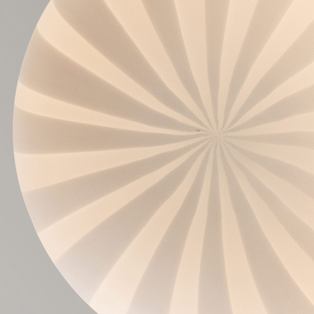 Die Lampe besteht aus einem weißen, filigranen Glasdiffusor, der handwerklich hergestellt wird , einem Material, das dem Licht Glanz und Modernität verleiht, das durch es hindurchtritt und eine erhabene und einnehmende Atmosphäre schafft, und einem abnehmbaren Aluminiumsockel.