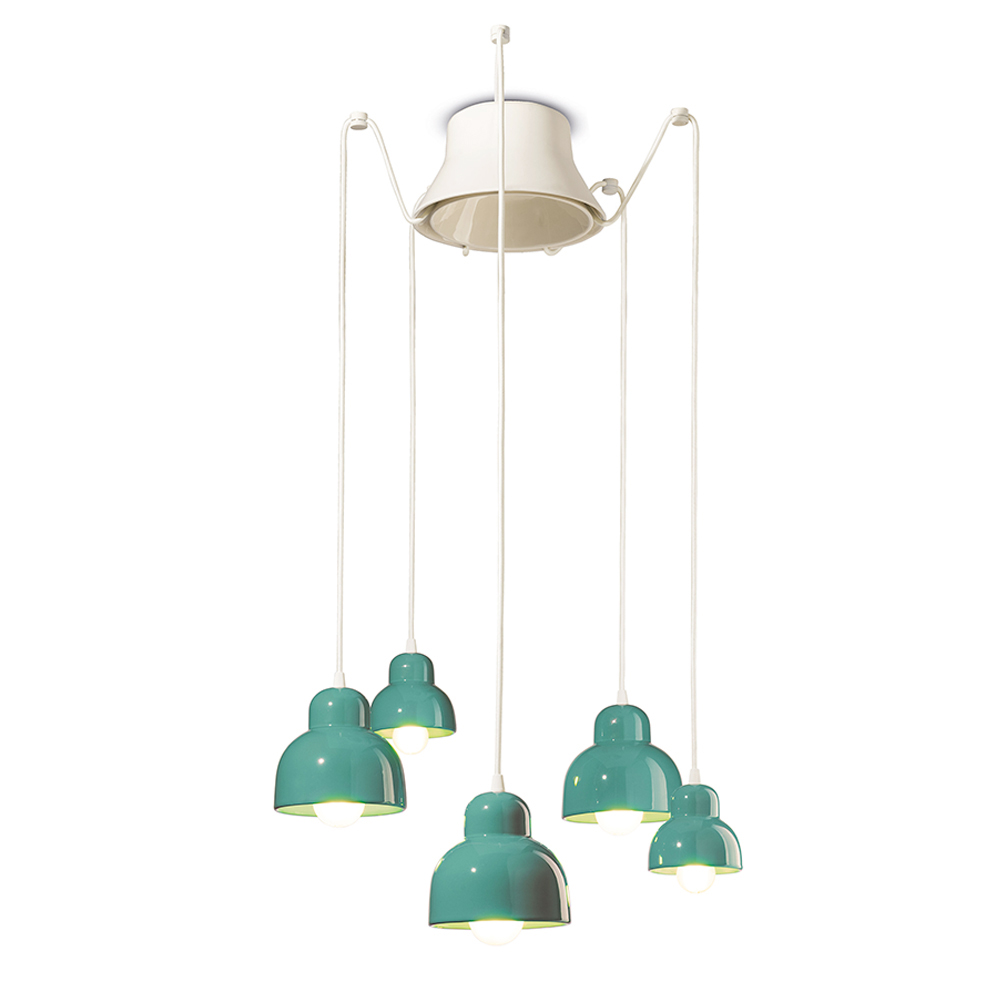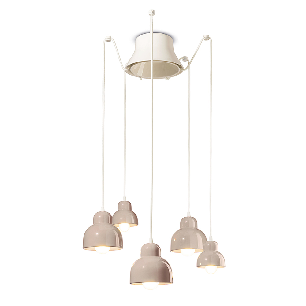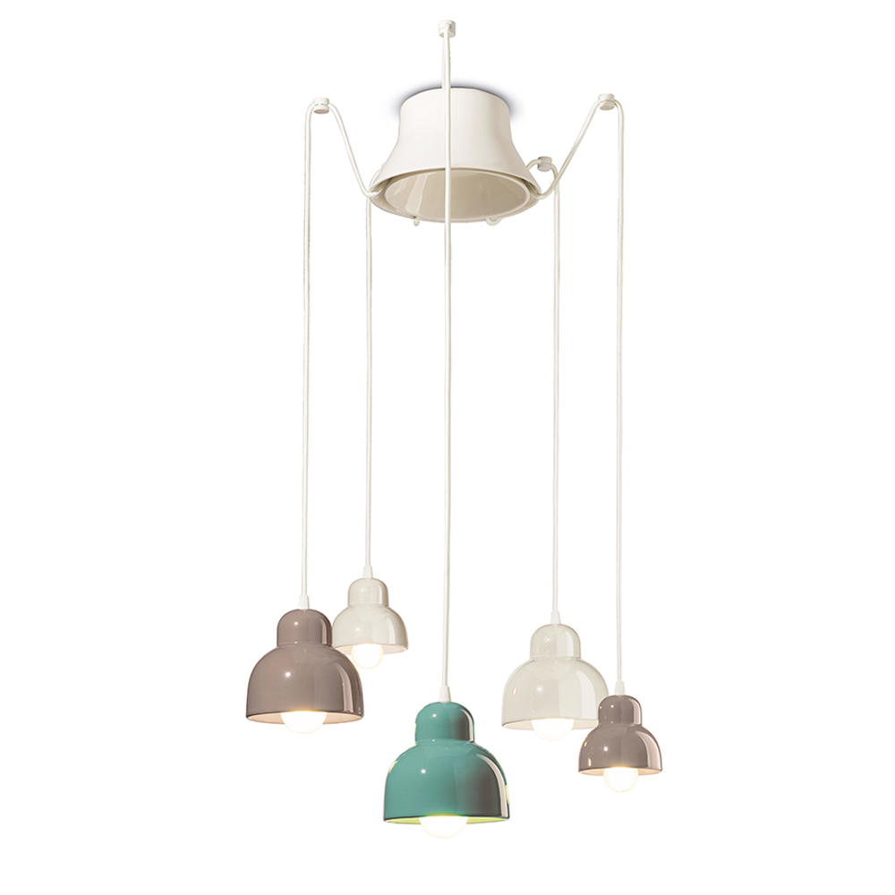 Diese Keramik-Pendelleuchte ist ein bezauberndes Beispiel für zeitgenössisches, von der Tradition inspiriertes Design . Ihre fünf Pendelleuchten strahlen in unterschiedlichen Höhen, wie ein visueller Tanz aus Formen und Lichtern im Raum.