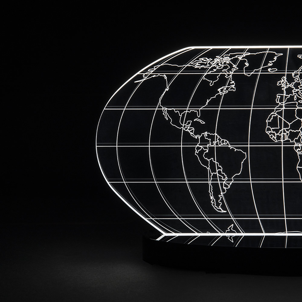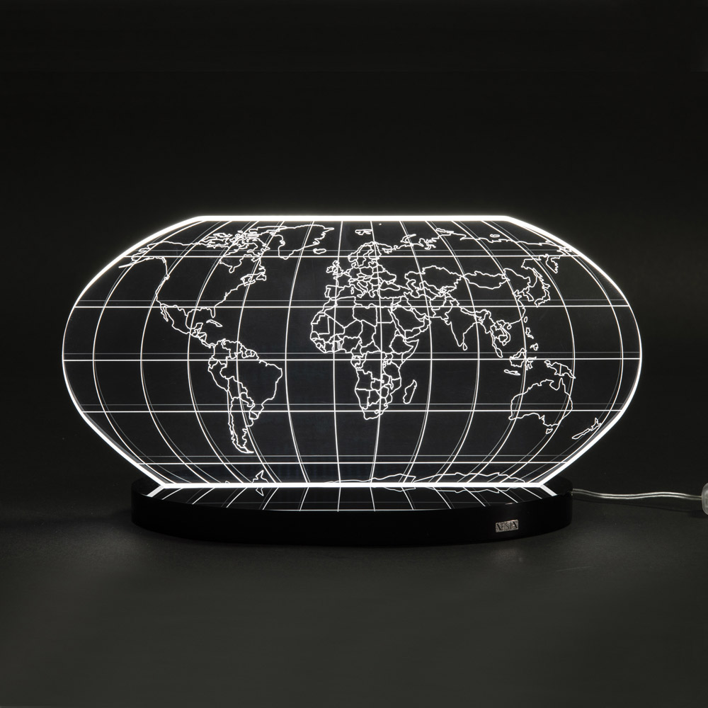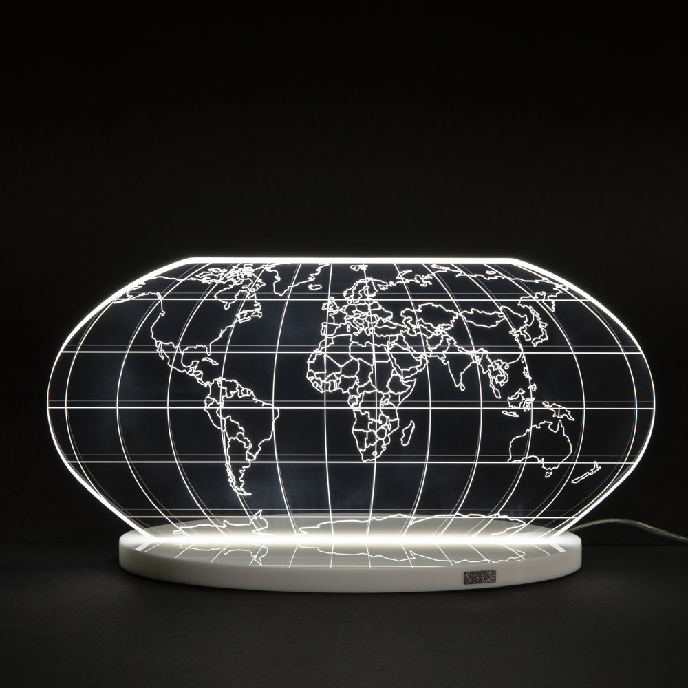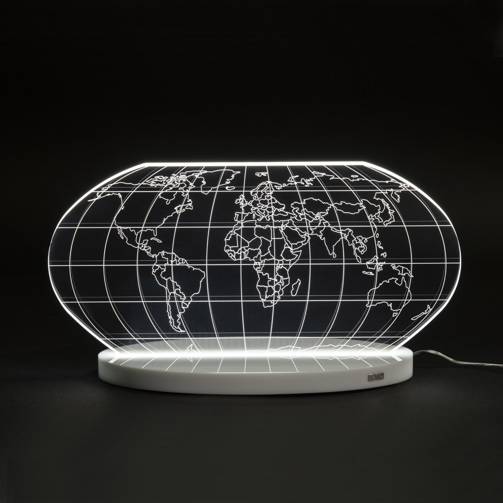 Tischlampe aus transparentem Acrylglas und lasergravierter Weltkarte, 2 Größen hergestellt in Italien.