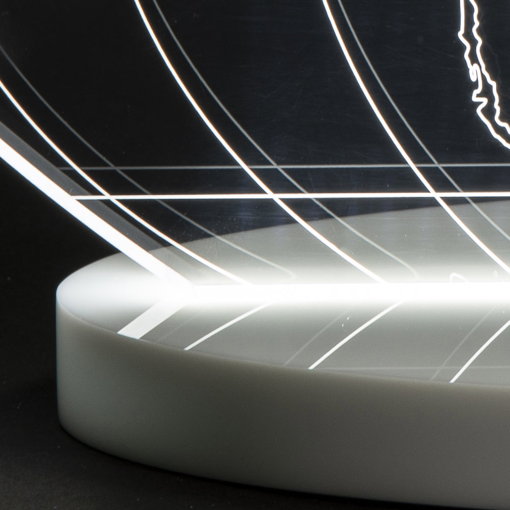 Die Lasergravuren leuchten auf der gesamten Oberfläche durch einen am Boden angebrachten LED-Streifen , erhältlich in zwei verschiedenen Farben, 20 mm dick.