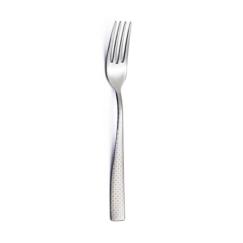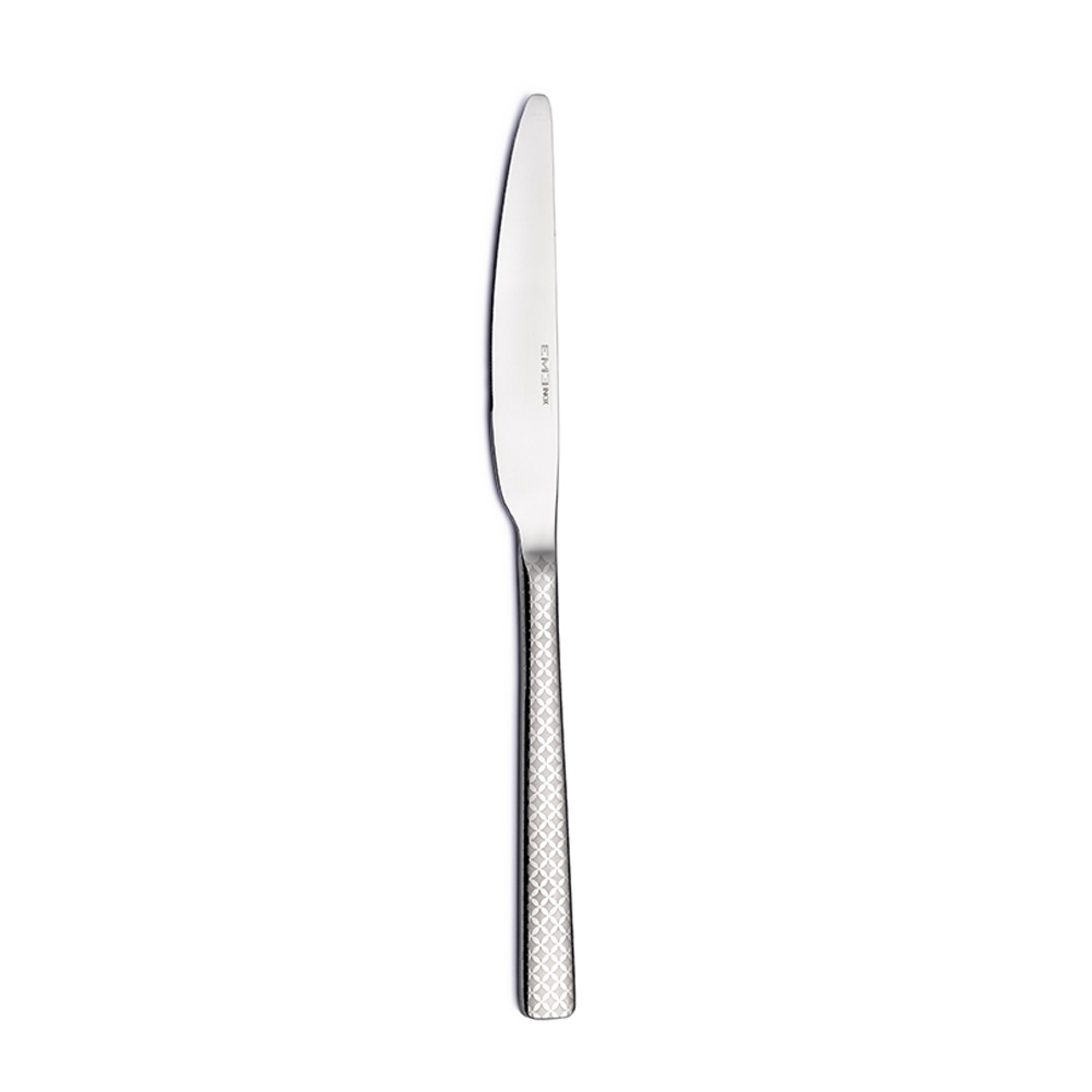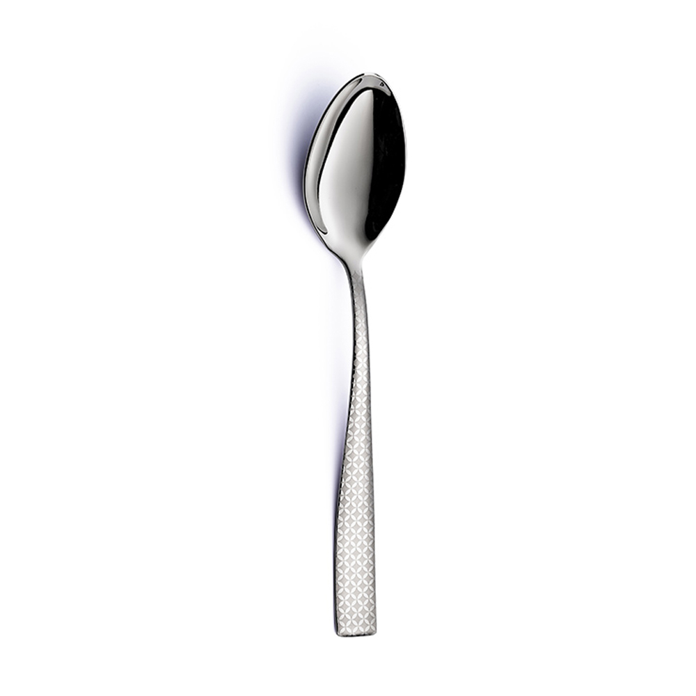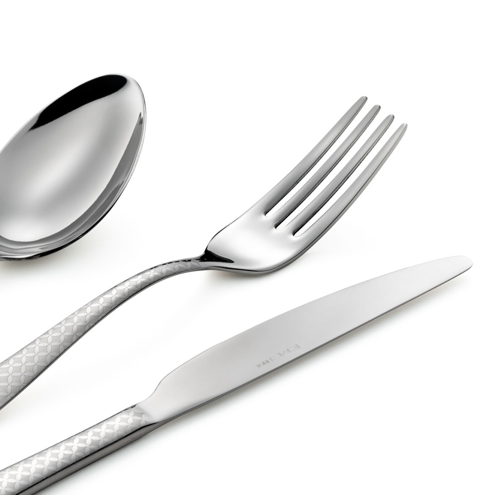 Die Kollektion zeichnet sich durch das anspruchsvolle geometrische Design mit Hightech- Laser aus. Das minimalistische Design der breiten Griffe, die geformte und längliche Form der Löffelschale und die Nüchternheit der Gabel evozieren eine Vorstellung von Reinheit und Unendlichkeit.