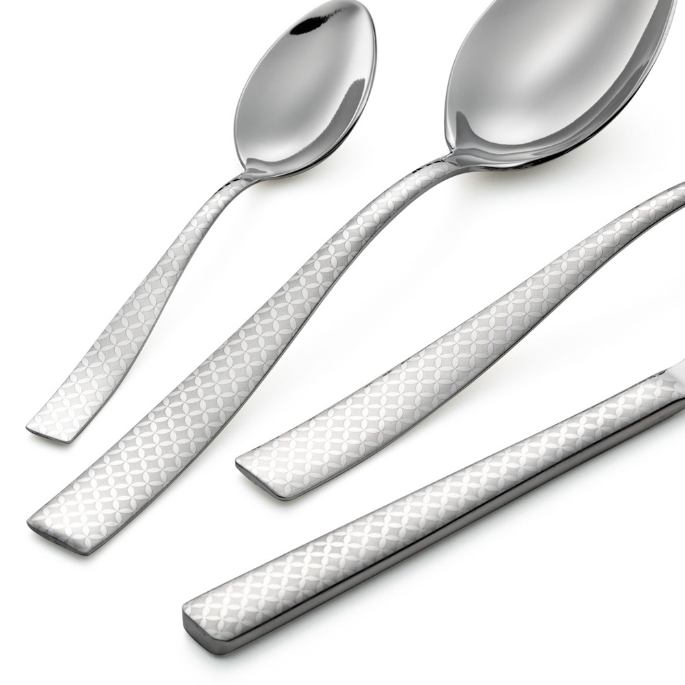 Minimalistisches Edelstahl-Besteckset mit geometrischer Laser-Dekoration, 24-teilig made in Italy.
