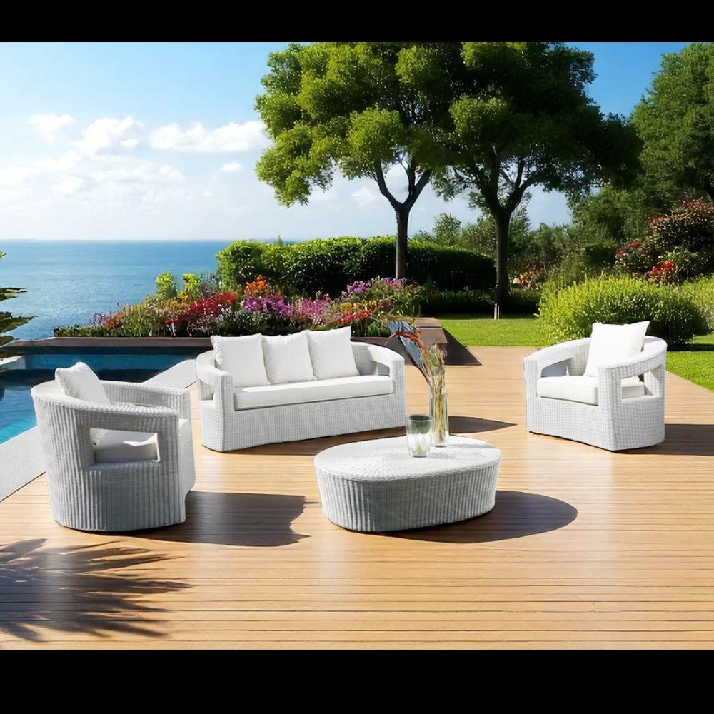 Outdoor-Lounge-Set bestehend aus 2 Sesseln und 1 3-Sitzer-Sofa mit Aluminiumrahmen , Polyrattan-Geflecht der Marke REHAU und Sitz- und Rückenkissen aus weißem Outdoorstoff .