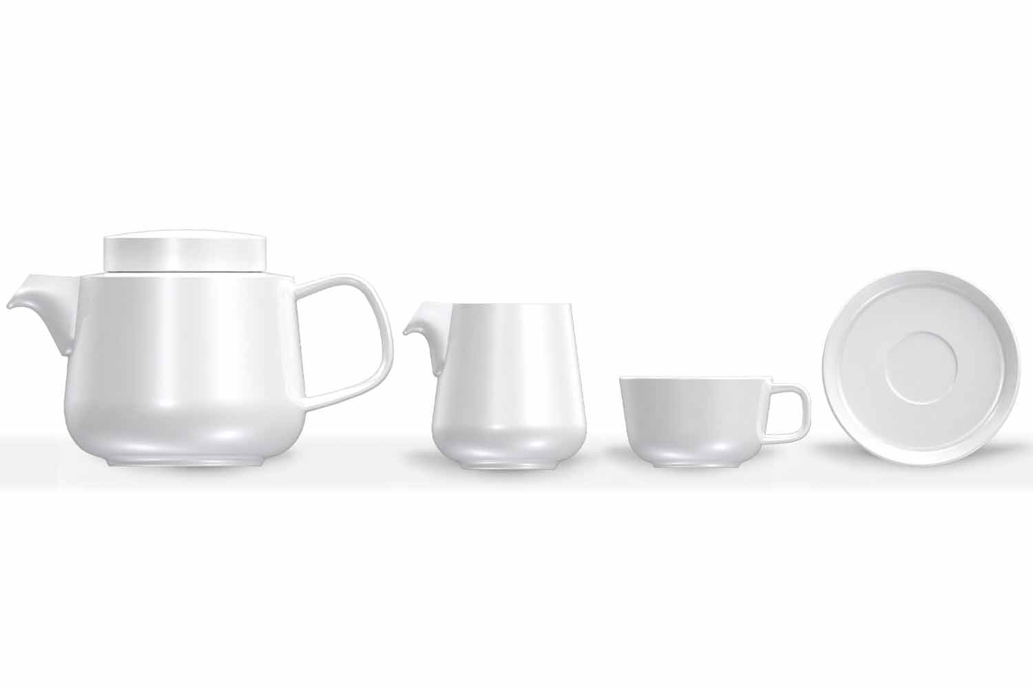 Teeservice mit Tassen, Untertassen, Teekanne und Milchkännchen aus skandinavisch inspiriertem Designporzellan 14 Stück.