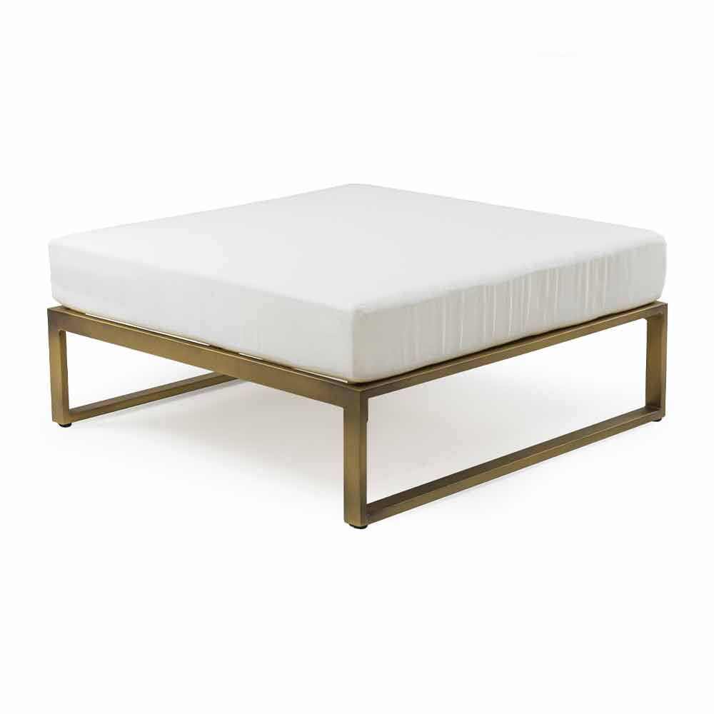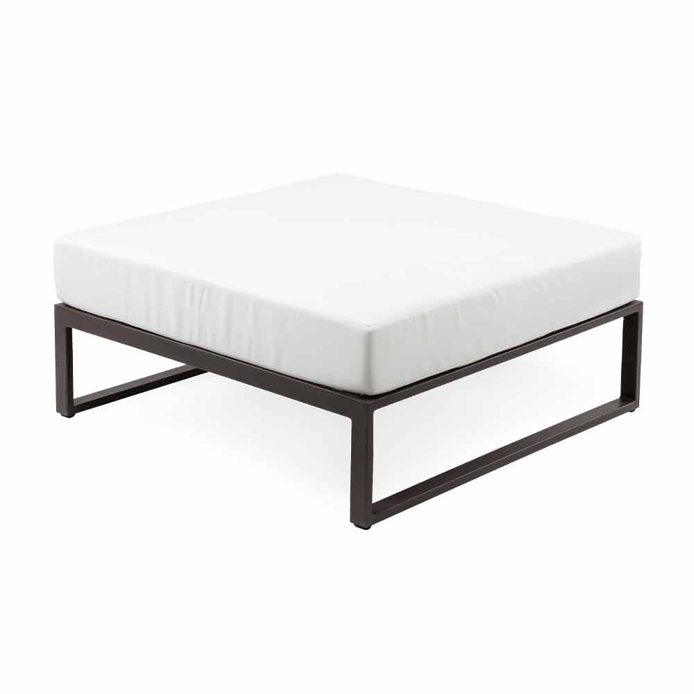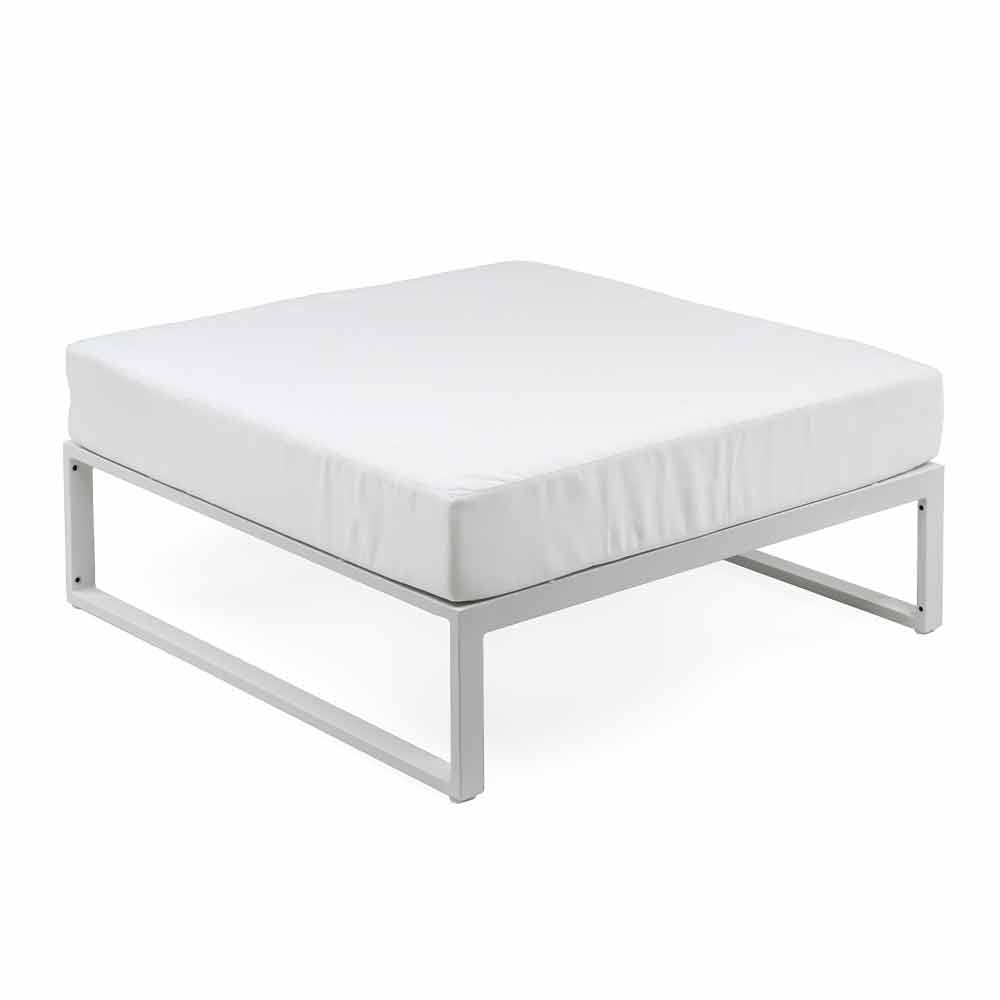 Quadratischer Hocker für das Wohnzimmer im Freien mit Aluminiumstruktur in 3 Ausführungen und weißem Stoffkissen, luxuriöses Design.