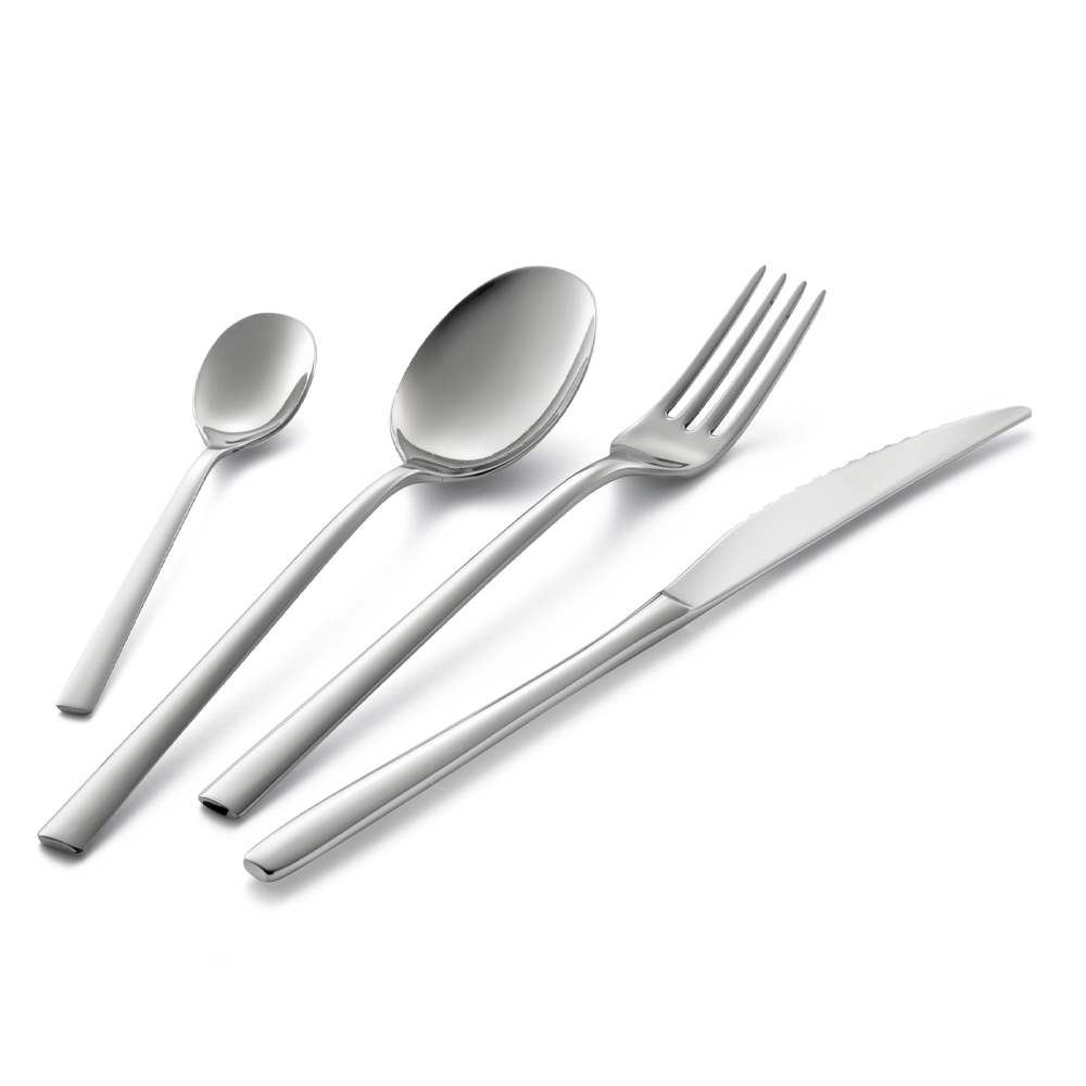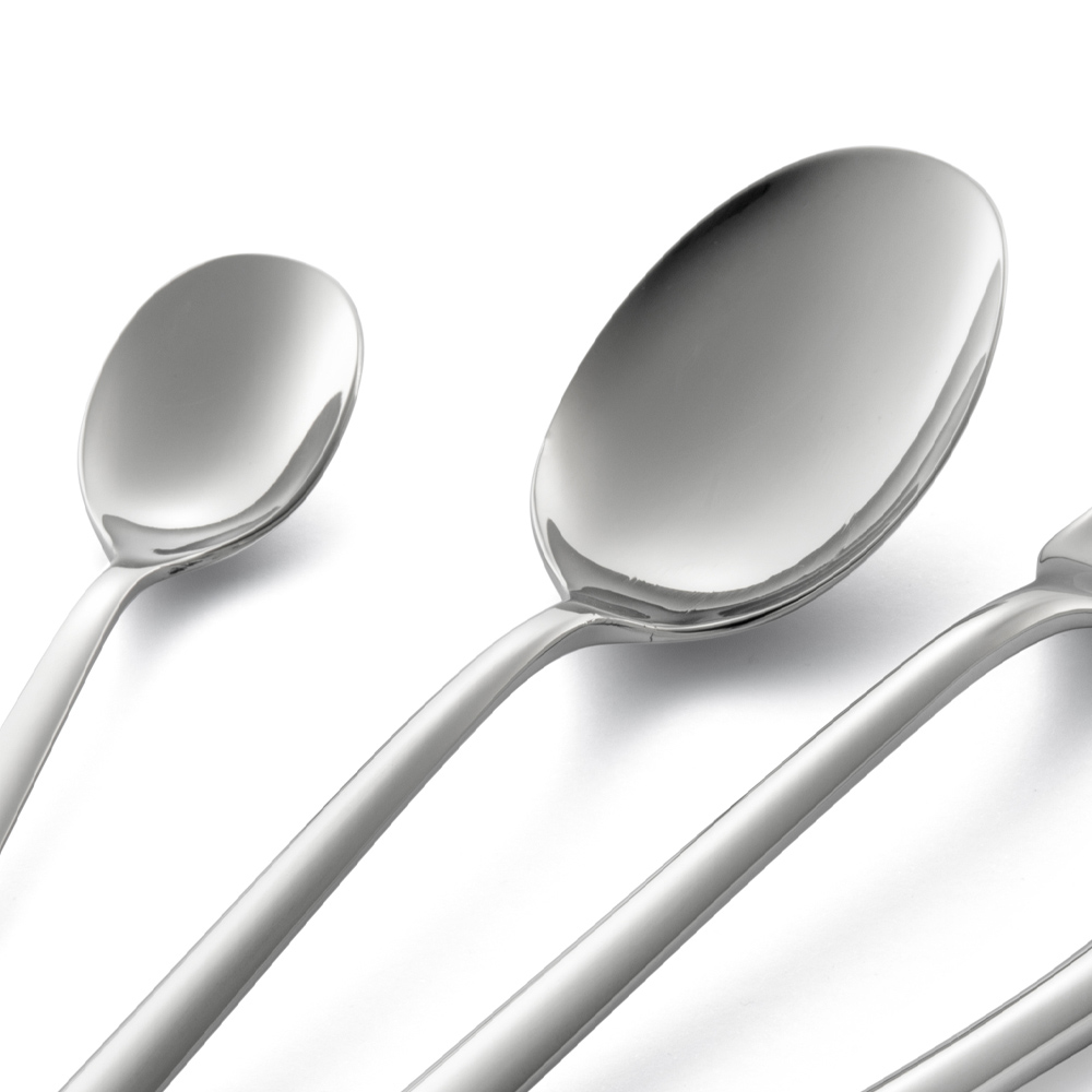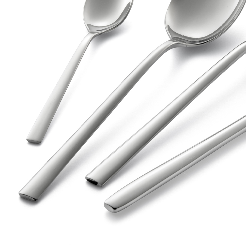 Die Kollektion zeichnet sich durch Löffeltasse und Teelöffel mit einer leicht eckigen Silhouette und linearen Griffen aus , während das Monobloc-Messer einen ergonomischeren, geschwungenen Griff hat. Das endgültige Design ist so elegant, raffiniert und trendy.