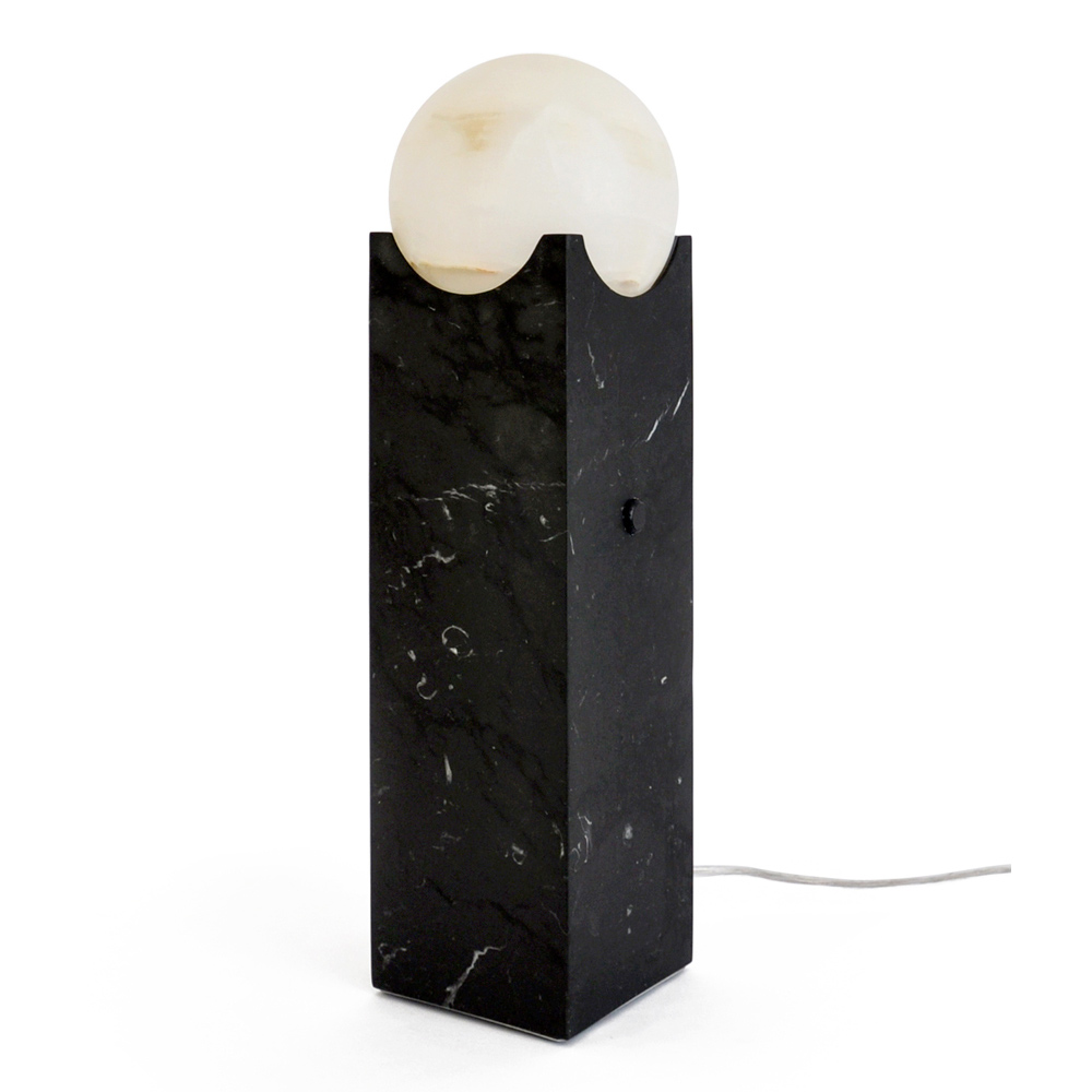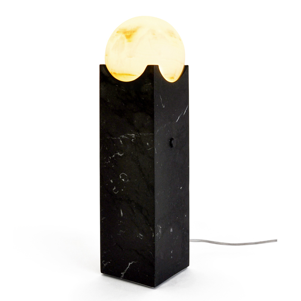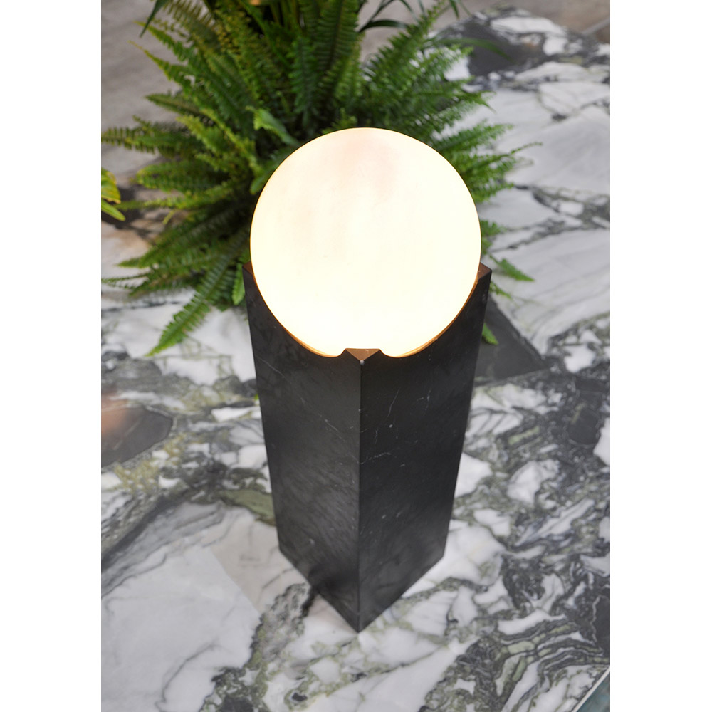 Diese Tischlampe stellt eine Verschmelzung der Erhabenheit von schwarzem Marmor mit der Reinheit einer Lichtkugel dar. Das kühne, moderne Design erzeugt einen starken, aber ausgewogenen visuellen Kontrast, perfekt für die zeitgenössische Einrichtung derjenigen, die gerne von Schönheit und Luxus umgeben sind.
