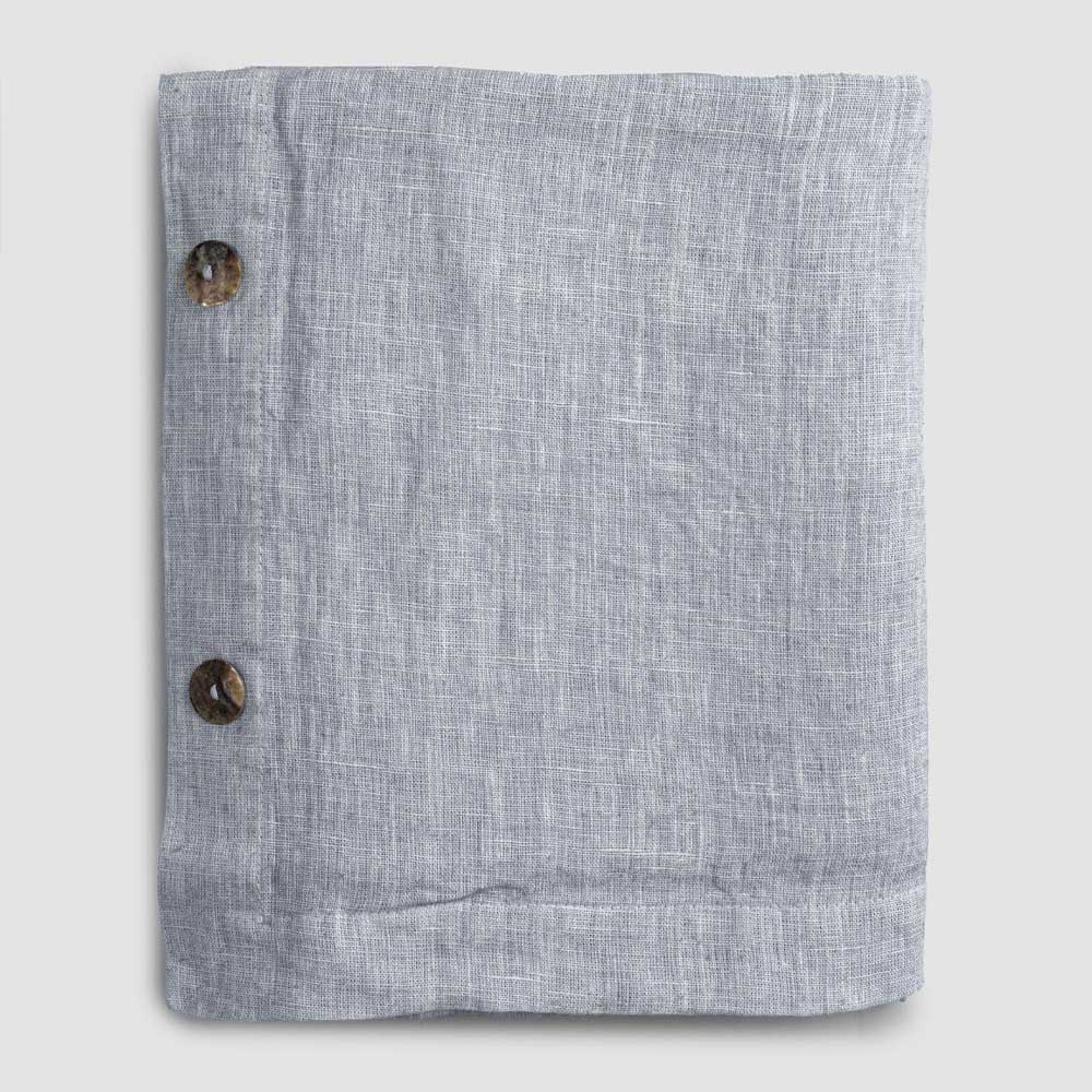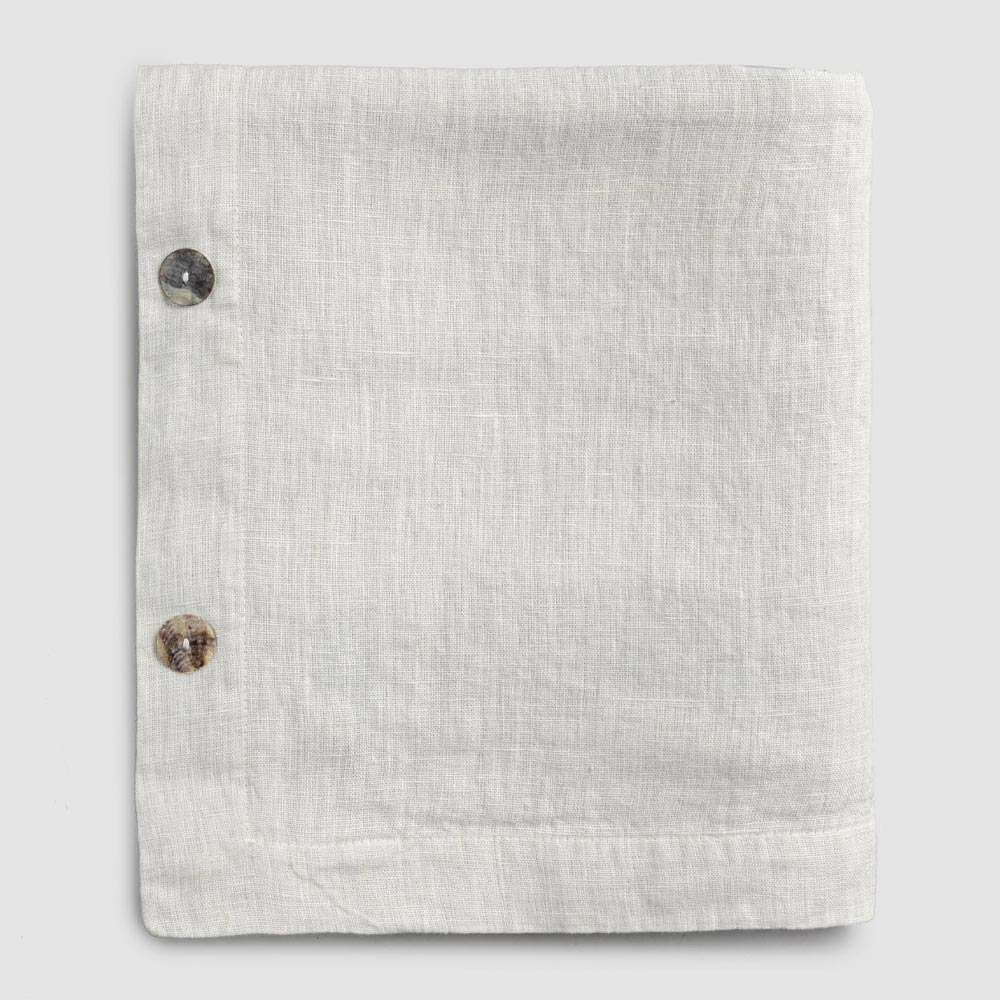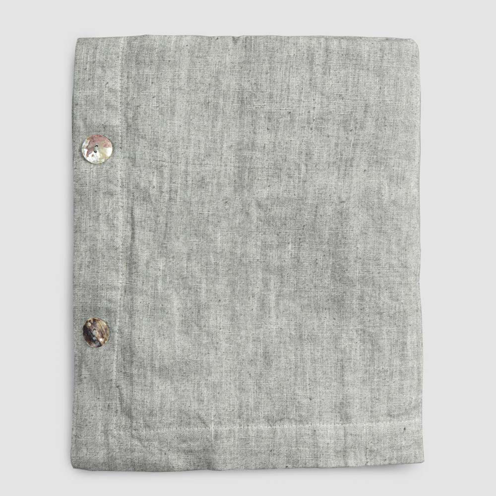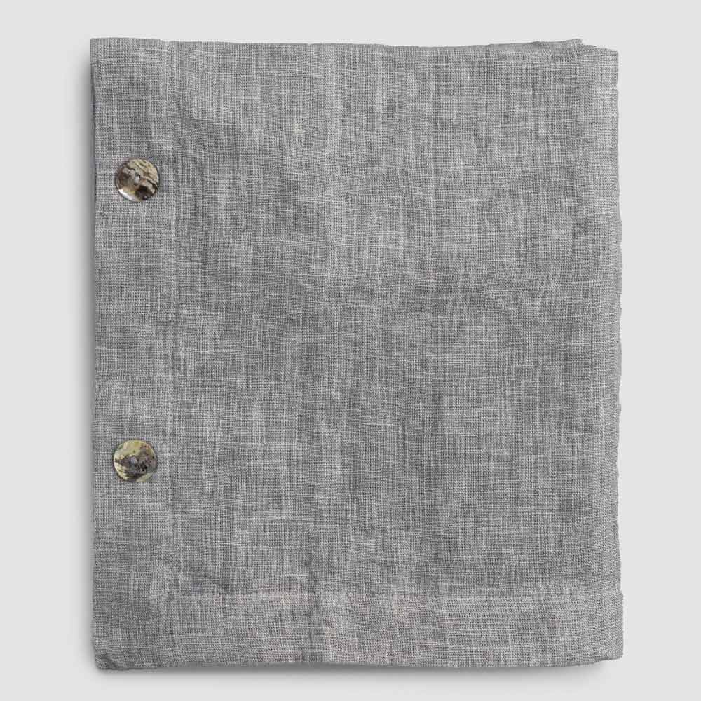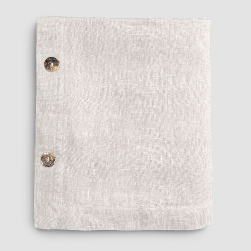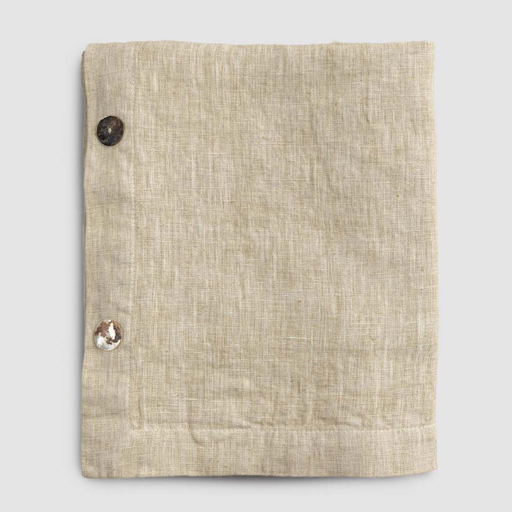 Der Wert der Tradition verbindet den modernen Lebensstil mit dieser schweren Leinentischdecke, die auf einer langen Seite mit einer Reihe von Agoya-Perlmuttknöpfen verziert ist.