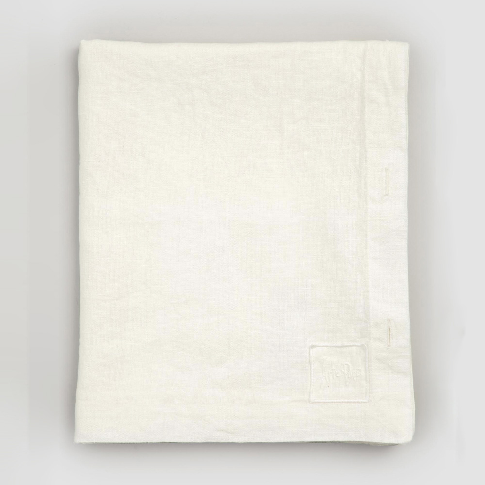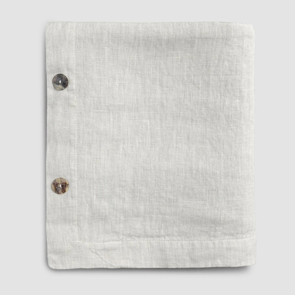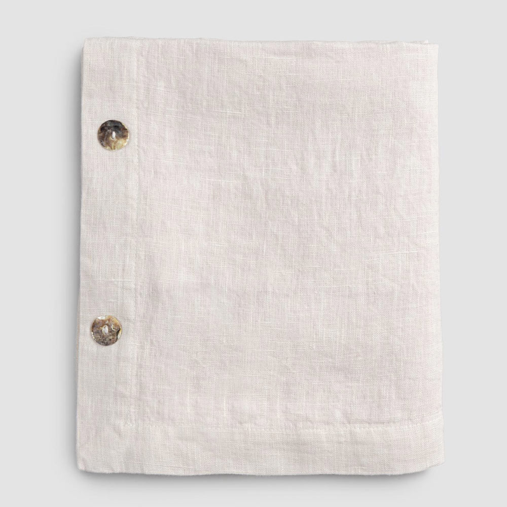 Der Wert der Tradition verbindet den modernen Lebensstil mit dieser schweren Leinentischdecke, die auf einer langen Seite mit einer Reihe von Agoya-Perlmuttknöpfen verziert ist.