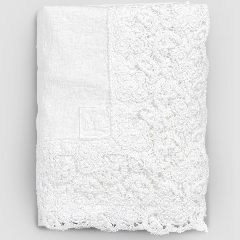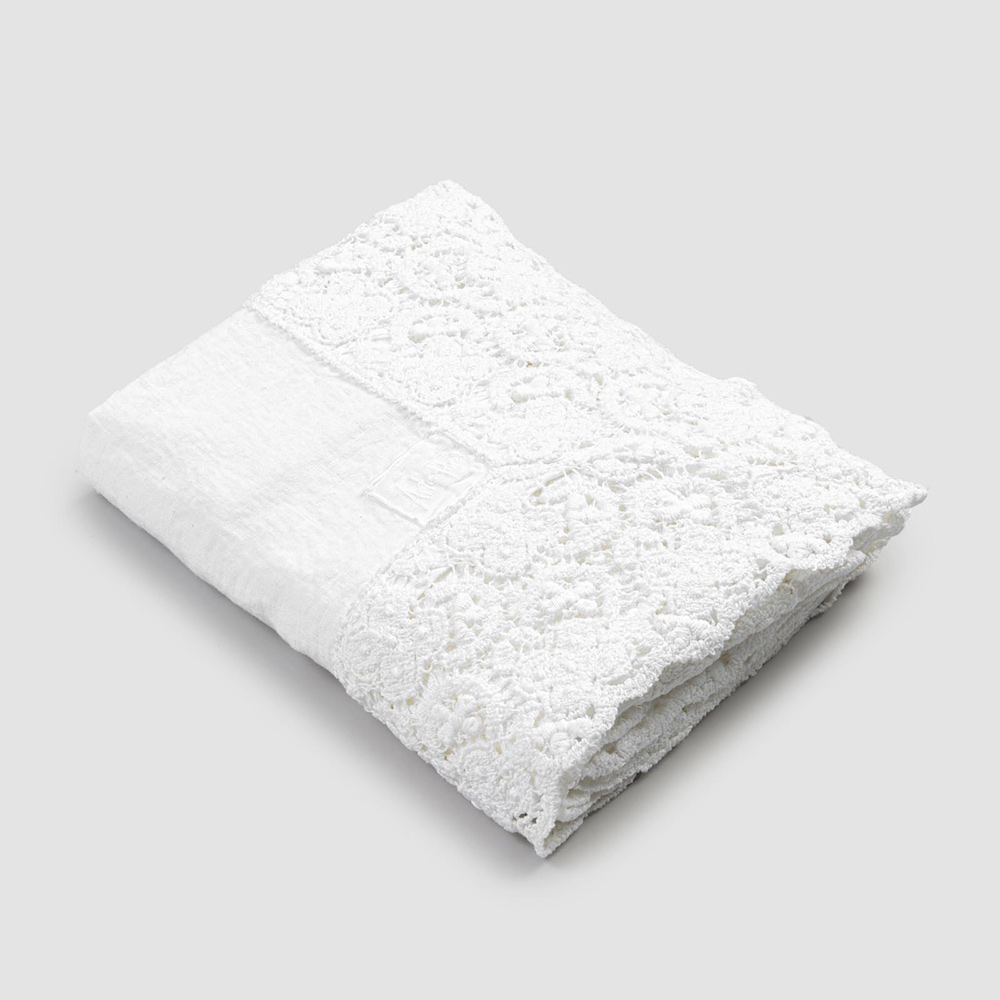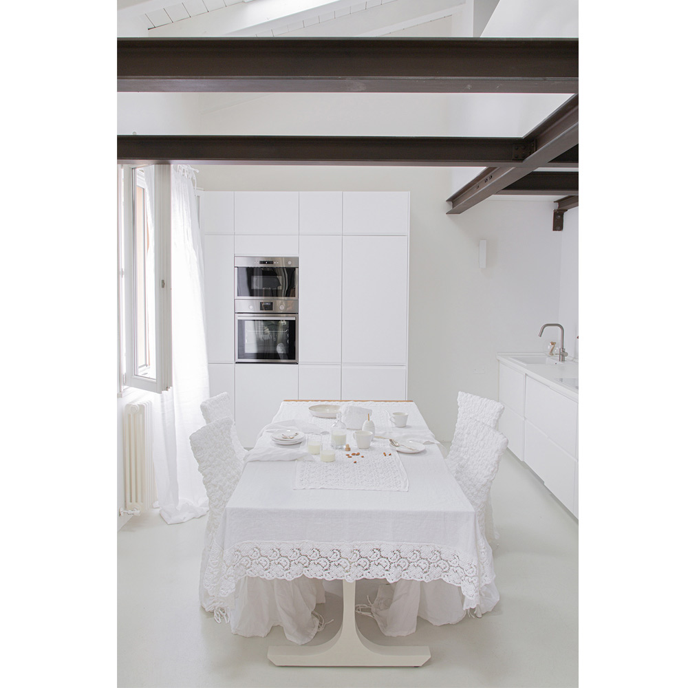 Tischdecke aus reinem weißem Leinen mit Spitze, hochwertiges Luxusdesign made in Italy.
