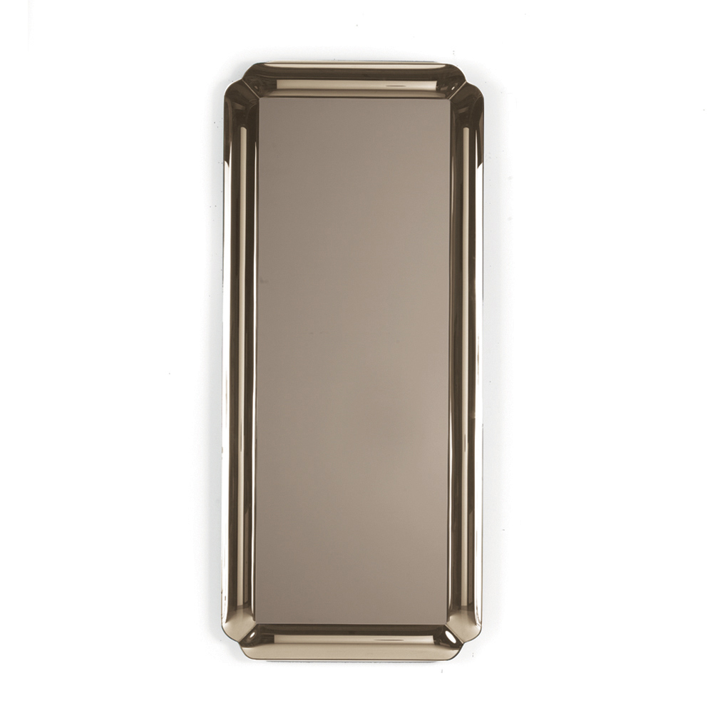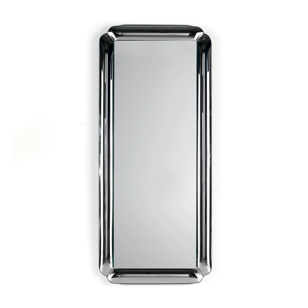 Der Spiegel besticht durch seine rechteckige Form und einen Ton-in-Ton gehaltenen Rahmen aus gegossenem Kristallglas mit fein geschliffenen Ecken . Die Spiegelfläche ruht auf dem Rahmen und erzeugt so ein raffiniertes Tiefenspiel , das die Oberfläche betont und der Komposition Leichtigkeit verleiht.