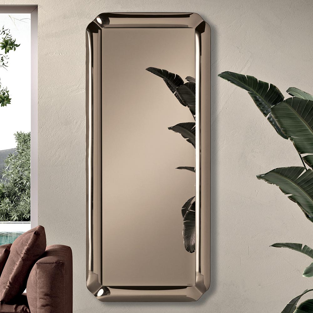 Ein eleganter , in Italien gefertigter Designer-Wandspiegel , ideal zur Verschönerung von Räumen wie Eingangsbereich , Wohnzimmer oder Schlafzimmer . Sein modernes Design zeichnet sich durch klare Linien und raffinierte Details aus, die dieses Accessoire zu einem dekorativen Element machen, das die Wand dezent und elegant aufwertet.