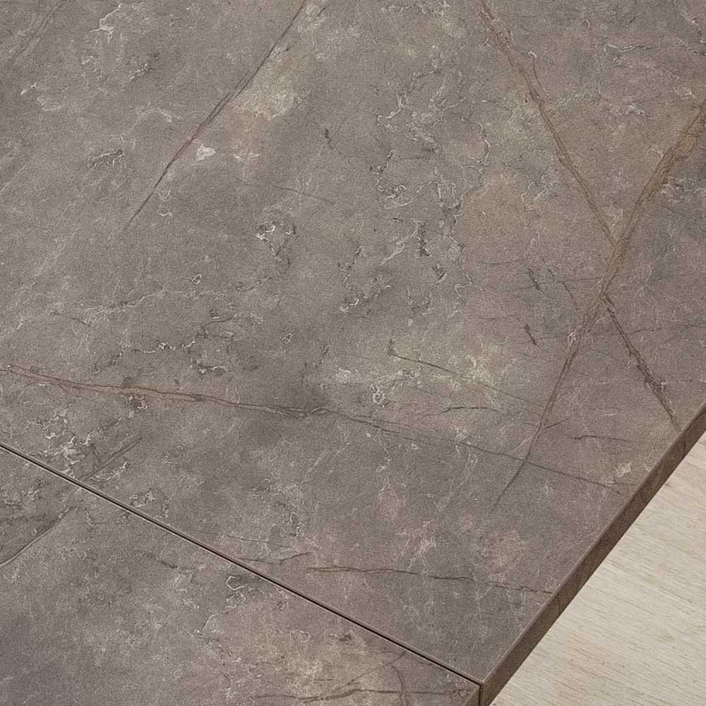 Die HPL- Platte mit Maserung bietet eine raffinierte und natürliche Ästhetik mit einer widerstandsfähigen Oberfläche, ideal für den täglichen Gebrauch. Dank des Ausziehsystems mit seitlichen Verlängerungen lässt sich der Tisch ganz einfach ausziehen und passt sich so an Familienessen oder Abende mit Freunden an.