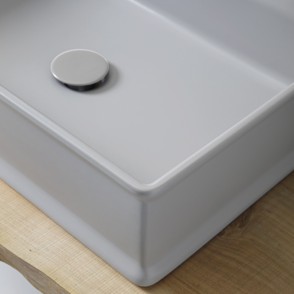 Rechteckiges Aufsatzwaschbecken aus undurchsichtiger farbiger Keramik durch eine 100% Made in Italy Handwerkskunst . Ein Design, das sich durch starke und imposante Linien und Merkmale auszeichnet, macht dieses Möbelstück zu einer perfekten zeitgenössischen Neuinterpretation einer Ästhetik mit Retro-Seele dank der Verwendung von Farben, die ein exklusives und raffiniertes Ergebnis zum Leben erwecken.