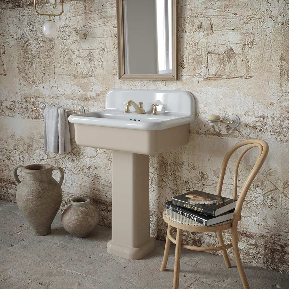 Badezimmerwaschbecken mit rechteckiger Struktur aus zweifarbiger Jute und weißer Keramik mit Keramiksäule, erhältlich in 2 Ausführungen.