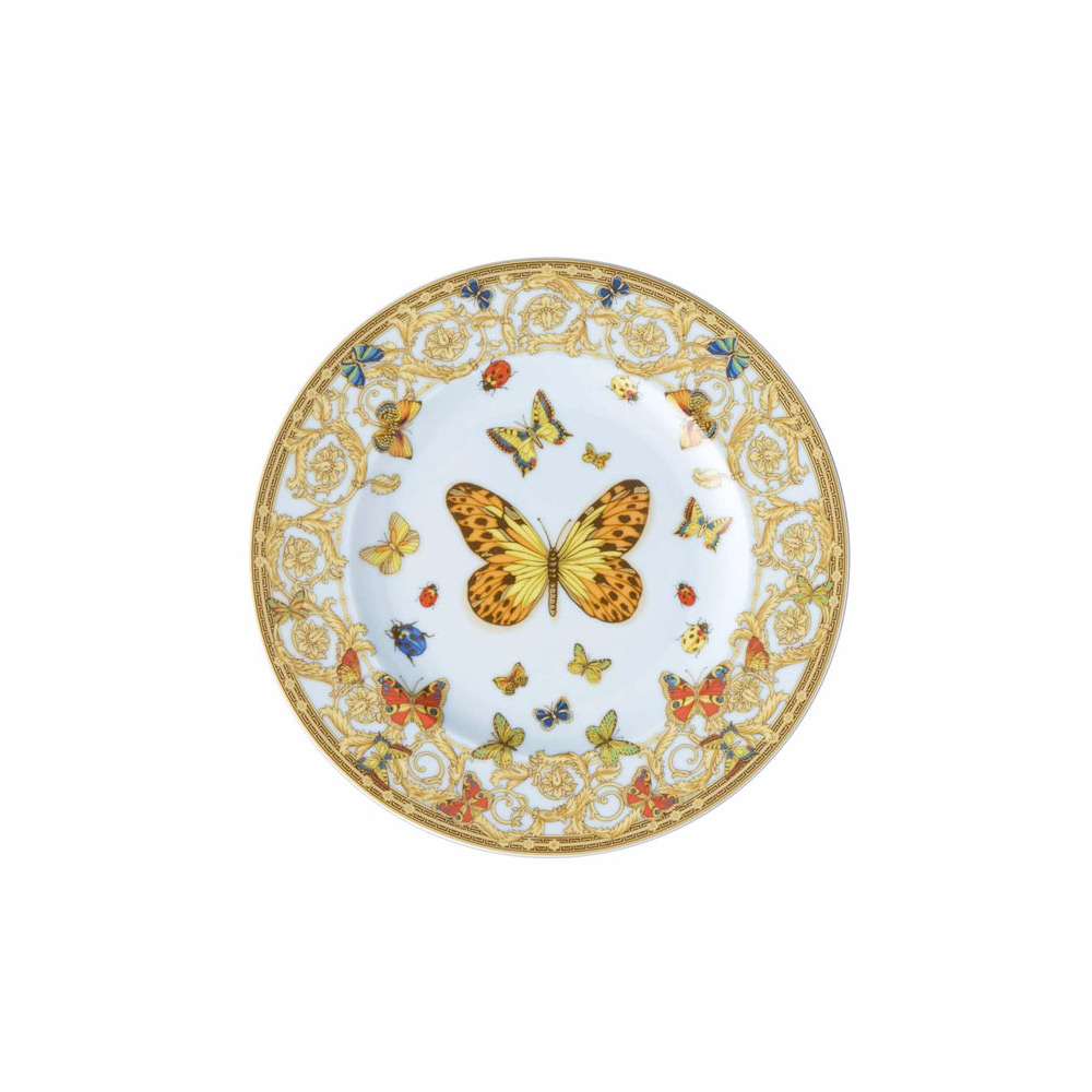Dieser bezaubernde Porzellanteller besticht durch sein helles und farbenfrohes Design, das sofort ins Auge fällt und ihn zu einem Sammlerstück und einem edlen Tischgeschirr macht. In der Mitte sticht ein eleganter Schmetterling hervor, umgeben von einem zarten Zierrand mit Blumen- und Arabeskenmotiven.