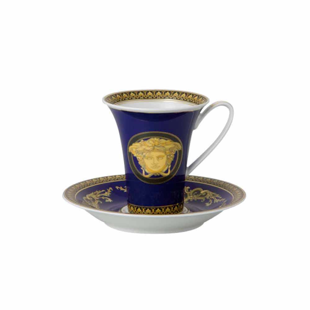 Die sehr stilvolle große Kaffeetasse mit Untertasse von Versace ist Teil der eleganten modernen Kollektion, die, kombiniert mit einem faszinierenden und raffinierten Glamour, an vergangene Epochen erinnert und in dem leuchtenden Blauton zum Ausdruck kommt und den Namen Medusa Blue trägt.