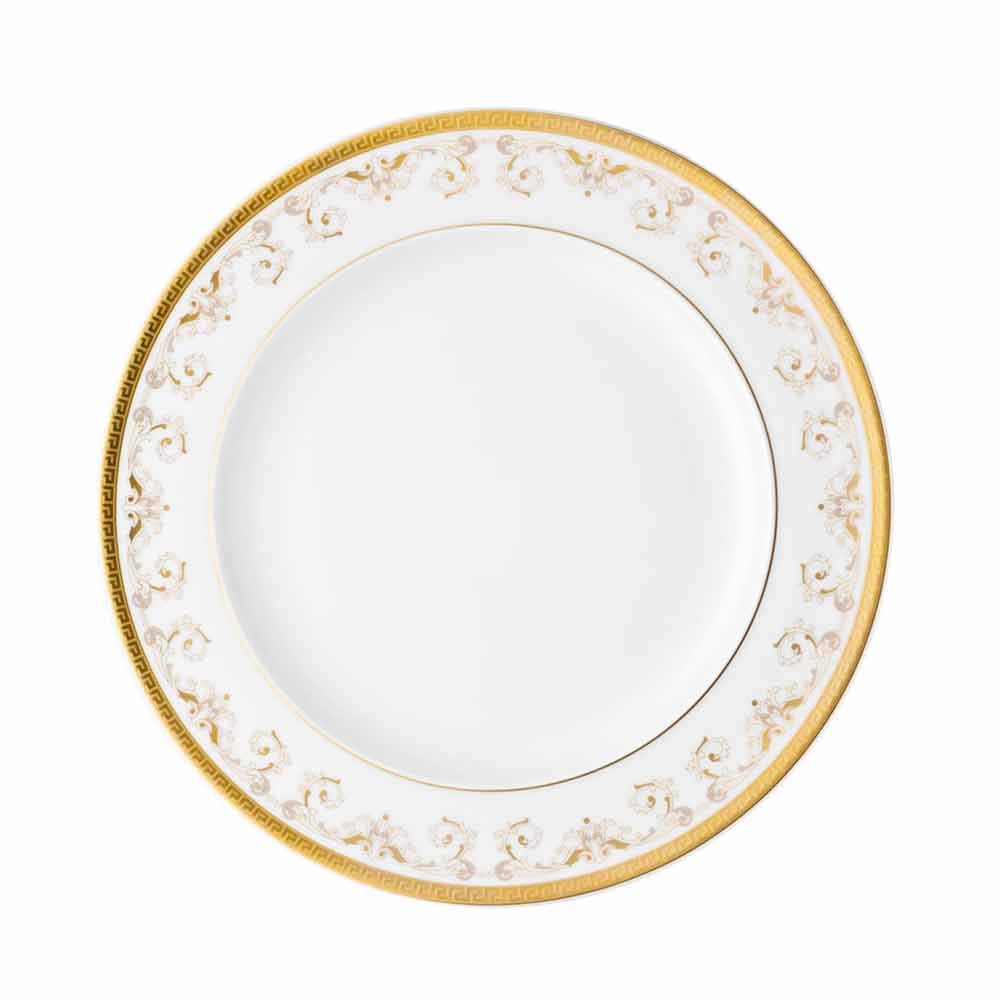Rosenthal Versace Medusa Gala Gold Flacher Teller 27cm Porzellan Design Der 27 cm große flache Teller von Versace ist Teil der raffinierten und luxuriösen Tischkollektion Medusa Gala Gold. Inspiriert von der Opulenz und der einzigartigen Atmosphäre von Galadinners interpretiert Medusa Gala die traditionellen Versace-Motive in Design und Dekoration neu: Die ikonische Darstellung der Medusa wechselt mit raffinierten barocken Ornamenten in kostbarem Goldfiligran. Ein aufregender Kontrasteffekt zwischen dem Weiß des Porzellans und dem reinen Gold erweckt eine perfekte Inszenierung zum Leben, modern und zugleich einzigartig. Medusa Gala ist mit Motiven und Dekorationen ganz in Gold bereichert und ist in einer noch luxuriöseren „Gold“-Version erhältlich, die sich perfekt zur Integration und weiteren Verschönerung des Tisches eignet.