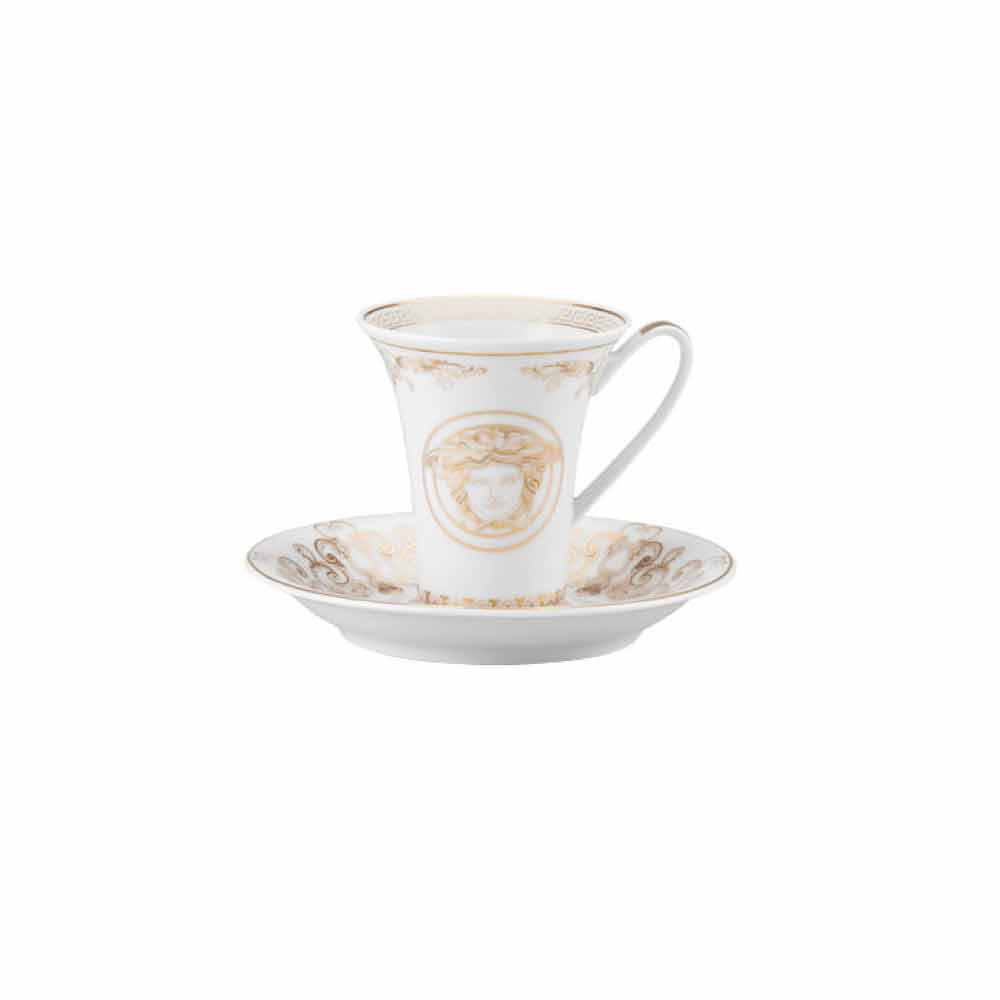 Rosenthal Versace Medusa Gala Design Kaffeetasse Porzellan Die edle Designer-Kaffeetasse mit Untertasse von Versace ist Teil der edlen und luxuriösen Medusa Gala-Tischkollektion. Inspiriert von der Opulenz und der einzigartigen Atmosphäre von Galadinners interpretiert Medusa Gala die traditionellen Versace-Motive in Design und Dekoration neu: Die ikonische Darstellung der Medusa wechselt mit raffinierten barocken Ornamenten in kostbarem Goldfiligran. Ein aufregender Kontrasteffekt zwischen dem Weiß des Porzellans und dem reinen Gold erweckt eine perfekte Inszenierung zum Leben, modern und zugleich einzigartig. Medusa Gala ist mit Motiven und Dekorationen ganz in Gold bereichert und ist in einer noch luxuriöseren „Gold“-Version erhältlich, die sich perfekt zur Integration und weiteren Verschönerung des Tisches eignet.