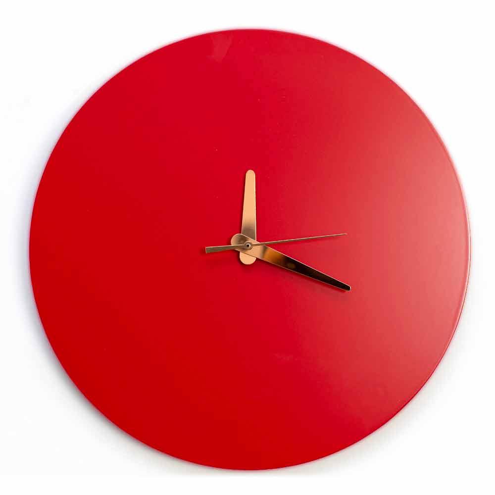Wanduhr aus rot und bronze lackiertem Holz, rundes und modernes Design, hergestellt in Italien.