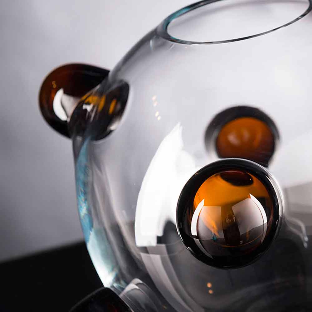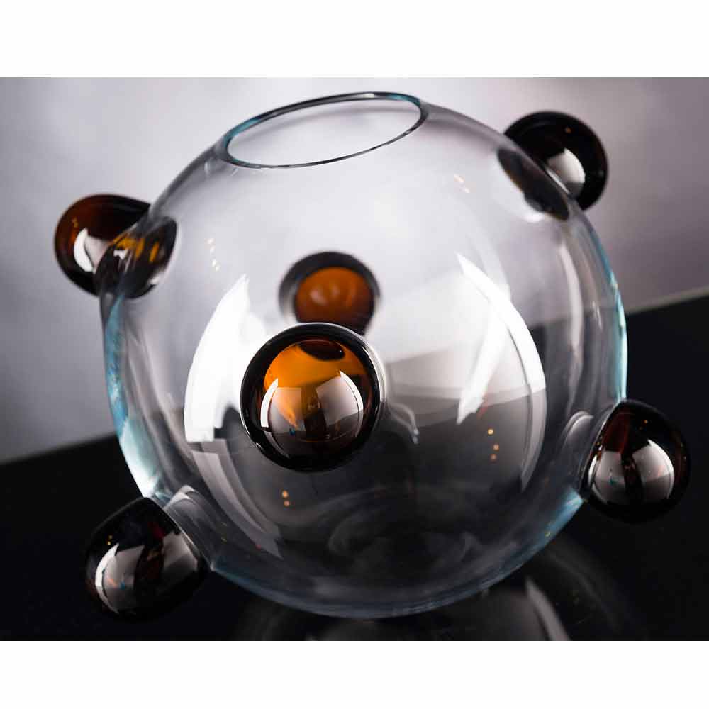Dekorative Innenvase mit Kugelform aus transparentem mundgeblasenem Muranoglas mit farbigen Details, vollständig in Italien hergestellt . Eine innovative Einrichtungsidee , die die Besonderheiten von Muranoglas verkörpert, und ein revolutionäres Design mit exklusiven und avantgardistischen Farbakzenten für ein lebendiges Ergebnis mit starker szenografischer Wirkung . Ein idealer Stil für die unterschiedlichsten Umgebungen, von der Wohnungseinrichtung bis hin zu Hotels, Restaurants, Objektbereichen, Spas, aber auch als Rahmen für Veranstaltungen und Hochzeiten.