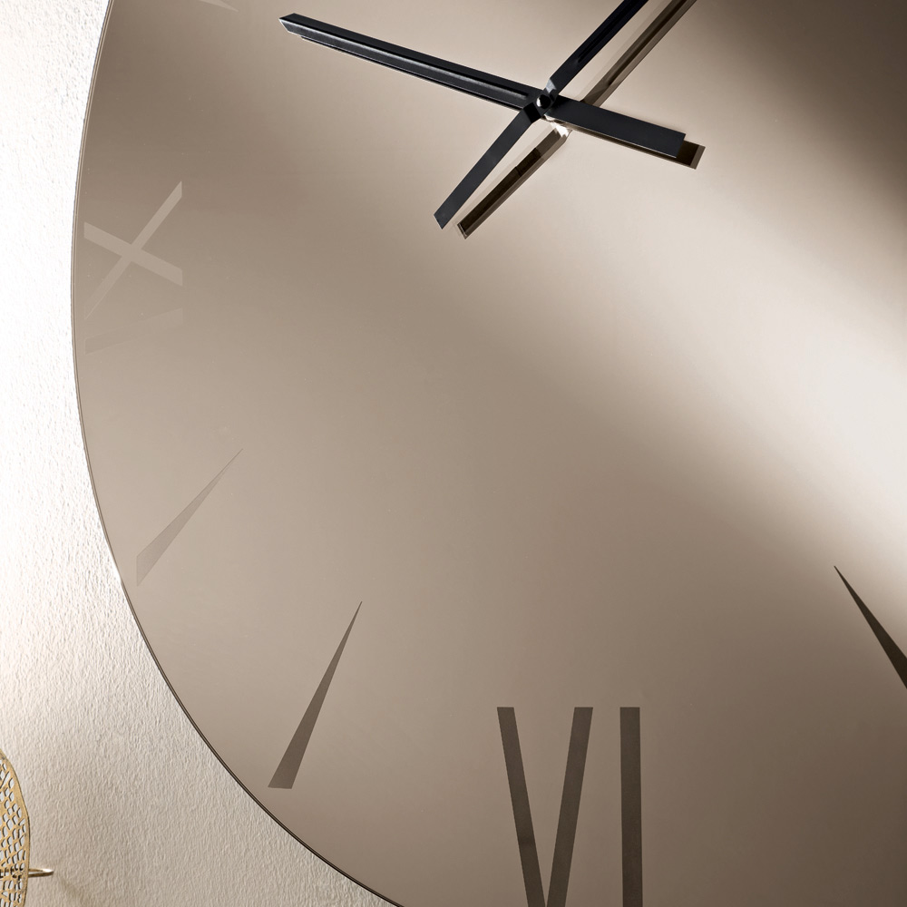 Die aus Spiegelglas gefertigte Uhr besticht durch ihre lasergravierten Ziffern , die mit grafischer Präzision und visueller Zurückhaltung gestaltet sind. Die reflektierende Oberfläche fängt das Licht ein und vergrößert den Raum, wodurch ein raffiniertes Zusammenspiel von Tiefe und Spiegelungen entsteht.