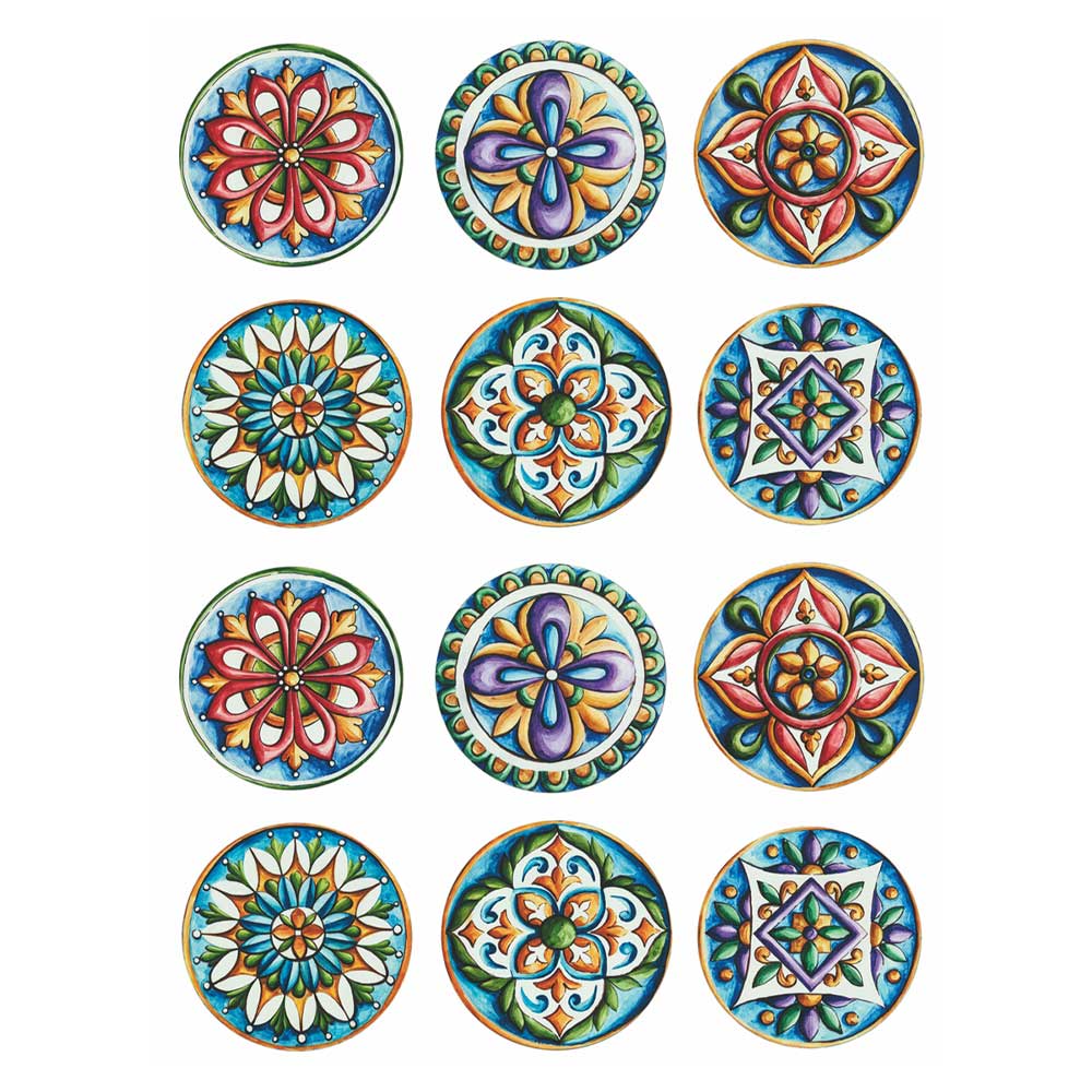 Runde bunte Tischsets aus Kunststoff mit Majolika-Design, 12 Stück.
