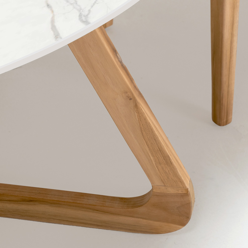 Der Holzsockel stützt nicht nur die robuste Keramiktischplatte, sondern verleiht ihr auch einen Hauch natürlicher Wärme und bildet einen faszinierenden optischen Kontrast zur glänzenden Marmorplatte. Diese Kombination ist nicht nur ästhetisch ansprechend , sondern bietet auch Haltbarkeit und Wetterbeständigkeit , wodurch der Tisch ideal für den täglichen Gebrauch im Freien ist.