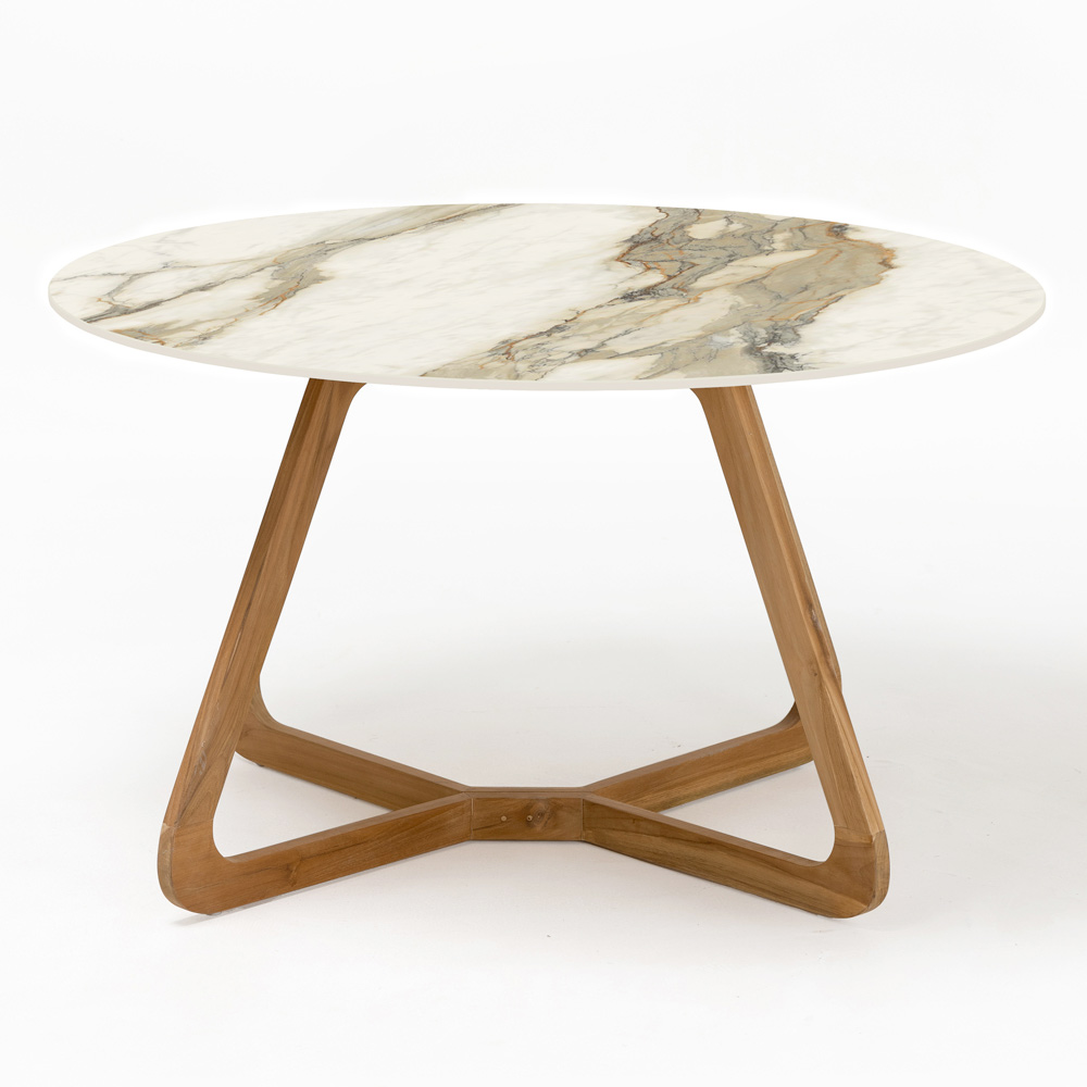 Tisch für den Außenbereich mit einer Basis aus massivem natürlichem Teakholz (35 mm dick), einer Platte aus Infinity-Steinzeugkeramik (12 mm dick) mit mattem Calacatta Hermitage- Finish und einem Untergestell aus Okumé-Bootssperrholz , vollständig in Italien hergestellt.