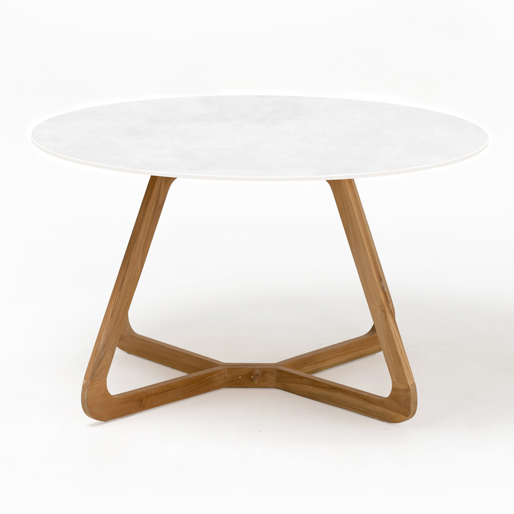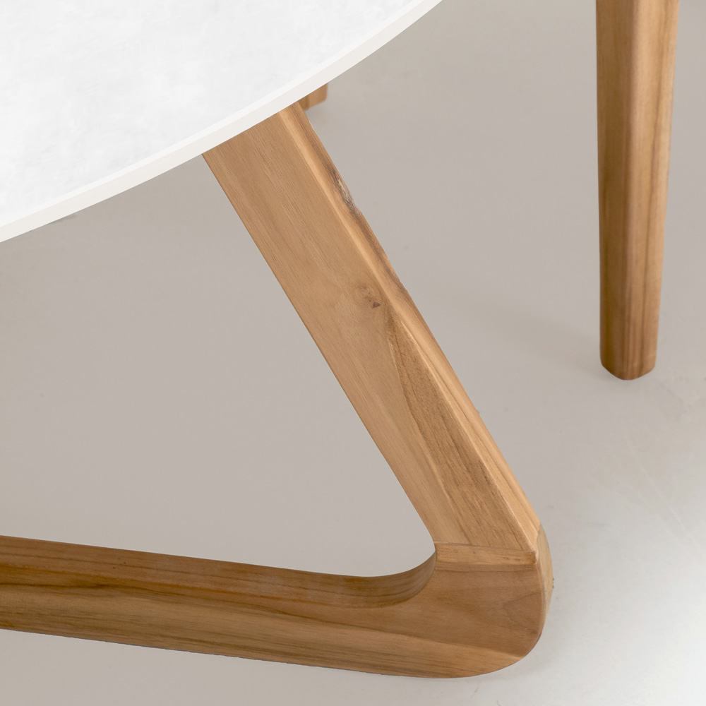 Gartentisch mit einer Basis aus massivem natürlichem Teakholz (35 mm dick), einer Infinity-Steinzeugkeramikplatte (12 mm dick) mit mattem Total White- Finish und einem Untergestell aus Okumé-Bootssperrholz , vollständig in Italien hergestellt.