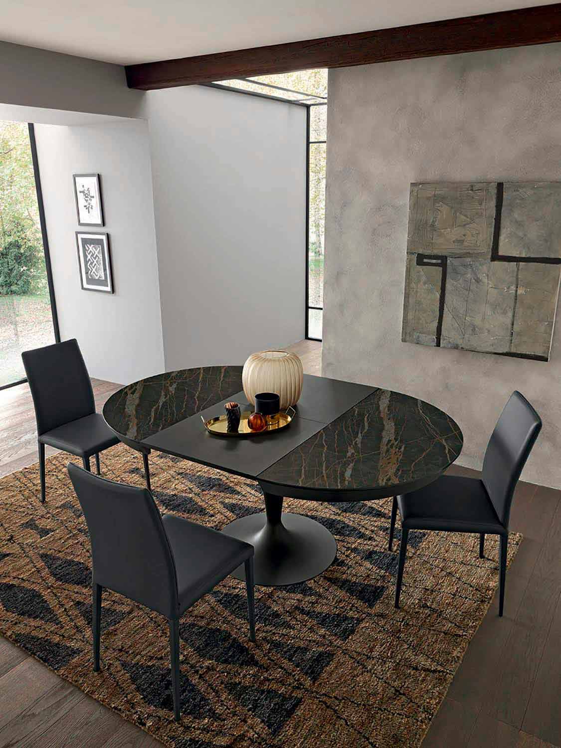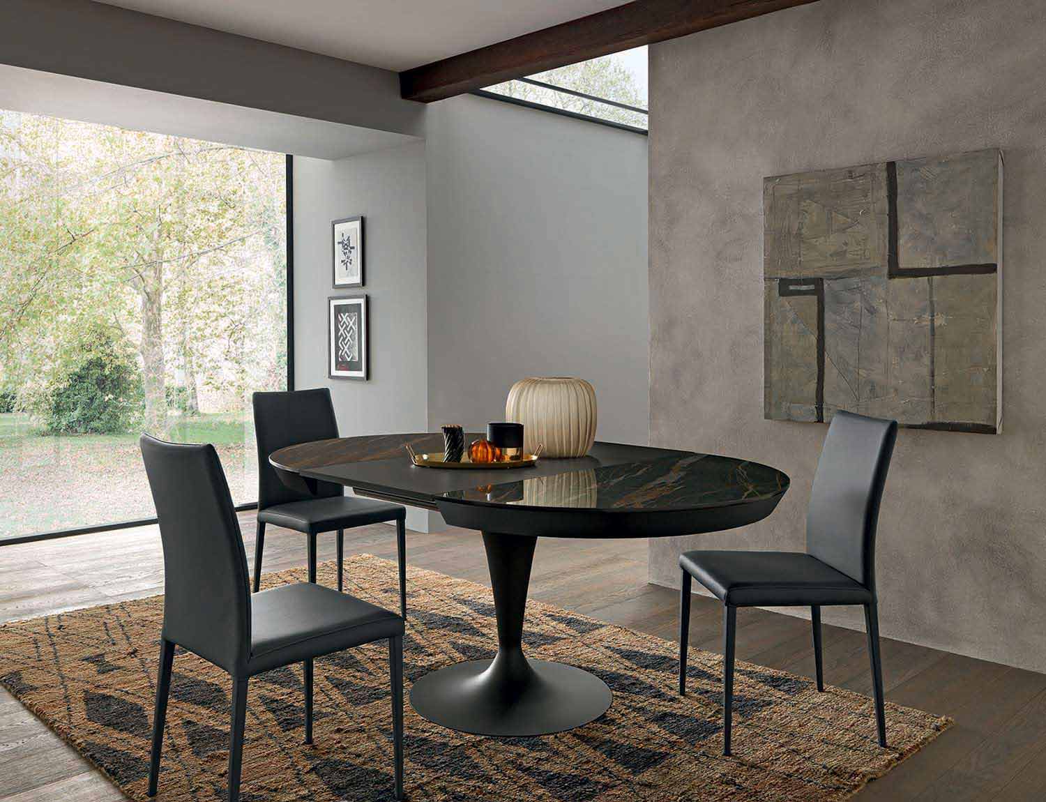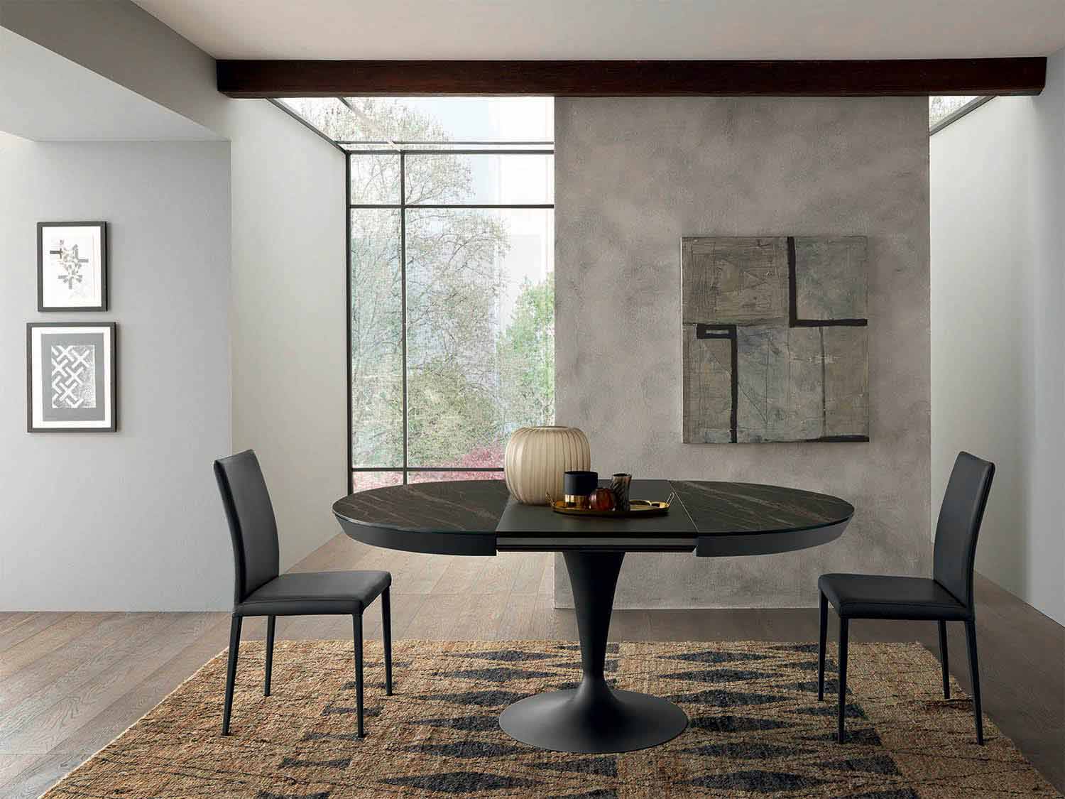 Ausziehbarer Design-Esstisch mit runder Laminam-Keramikplatte und Metallfuß Made in Italy.