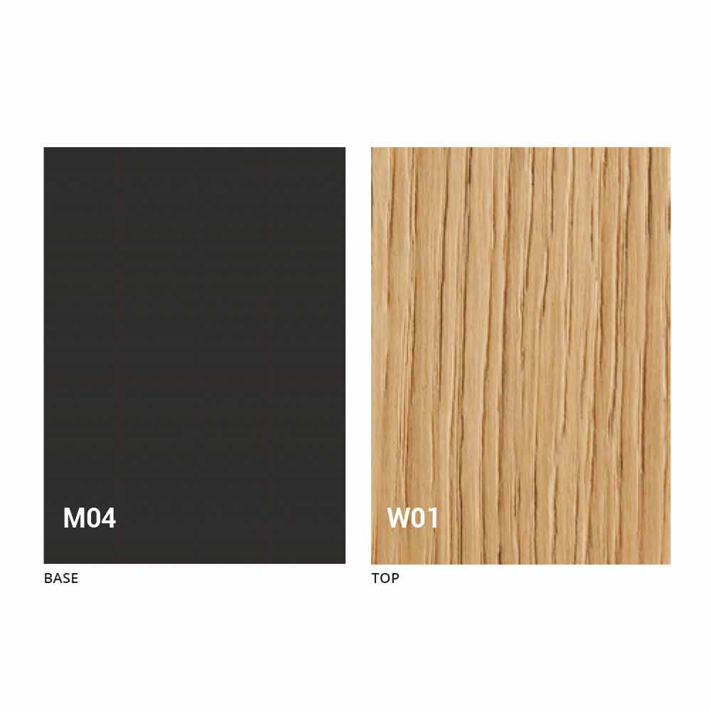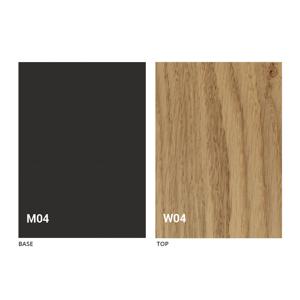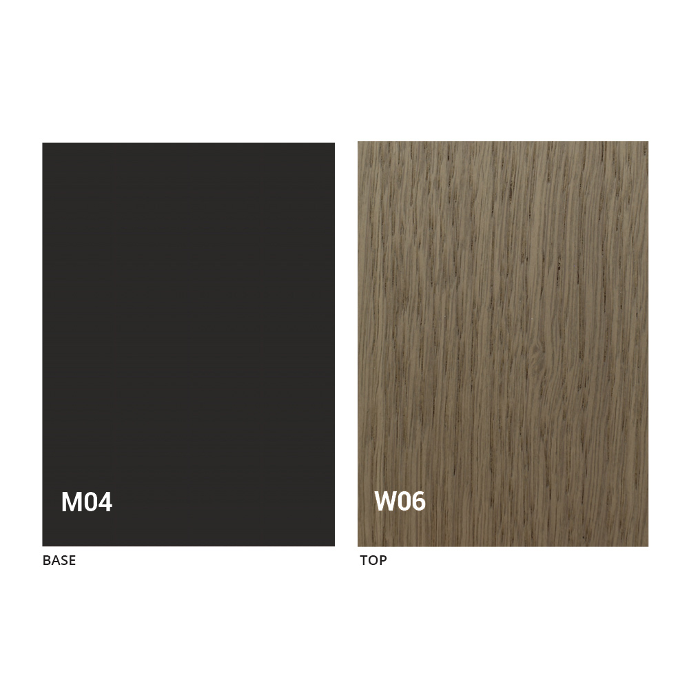 Gekennzeichnet durch eine ausziehbare Platte aus furnierter Eiche und eine Basis aus mattschwarz lackiertem Metall .