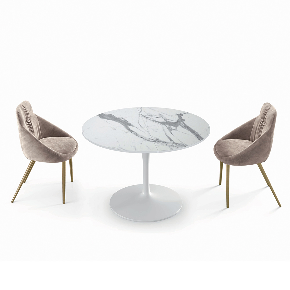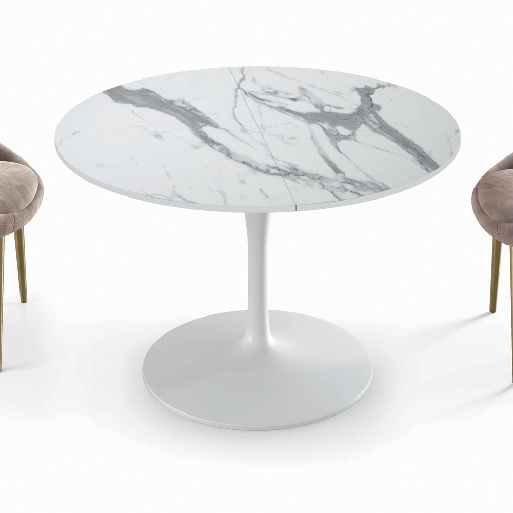 Ausziehbarer Wohnzimmertisch mit separaten Verlängerungen zum Einsetzen,Laminatplatte mit mattem Statuenfinish,45° abgeschrägte Kante, Untergestell aus glänzend weiß lackiertem Aluminiumguss. Die Produktkette, von der Konzeption über die Produktion bis hin zur Qualitätskontrolle, wird vollständig in Italien durchgeführt, um die typischen Merkmale des italienischen „Know-hows“ und die Bedeutung des typischen Made in Italy zu gewährleisten und zu bewahren. Dieses Produkt mit modernem Stil hat das Hauptziel, täglich verwendet werden zu können, ohne auf Design zu verzichten.
