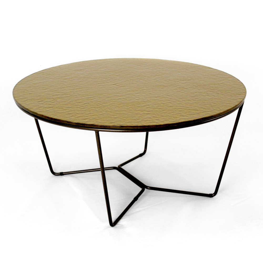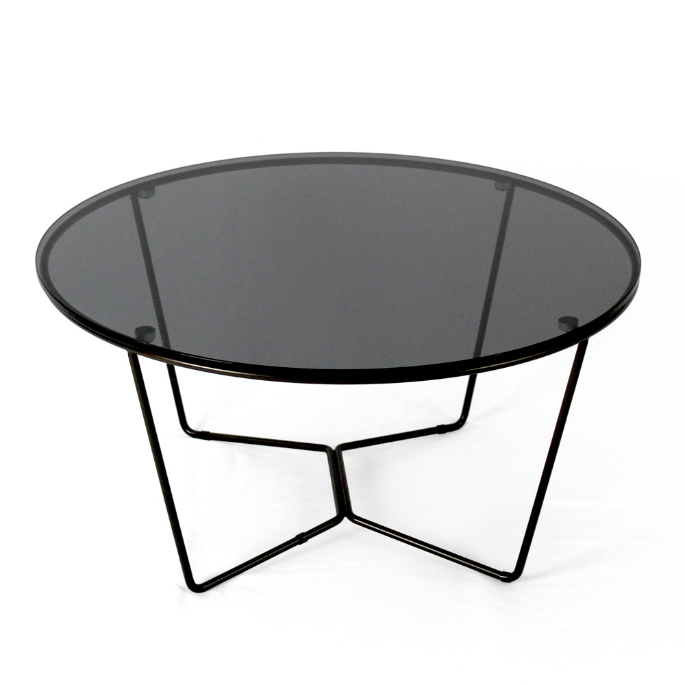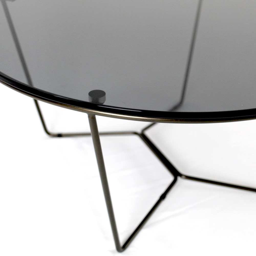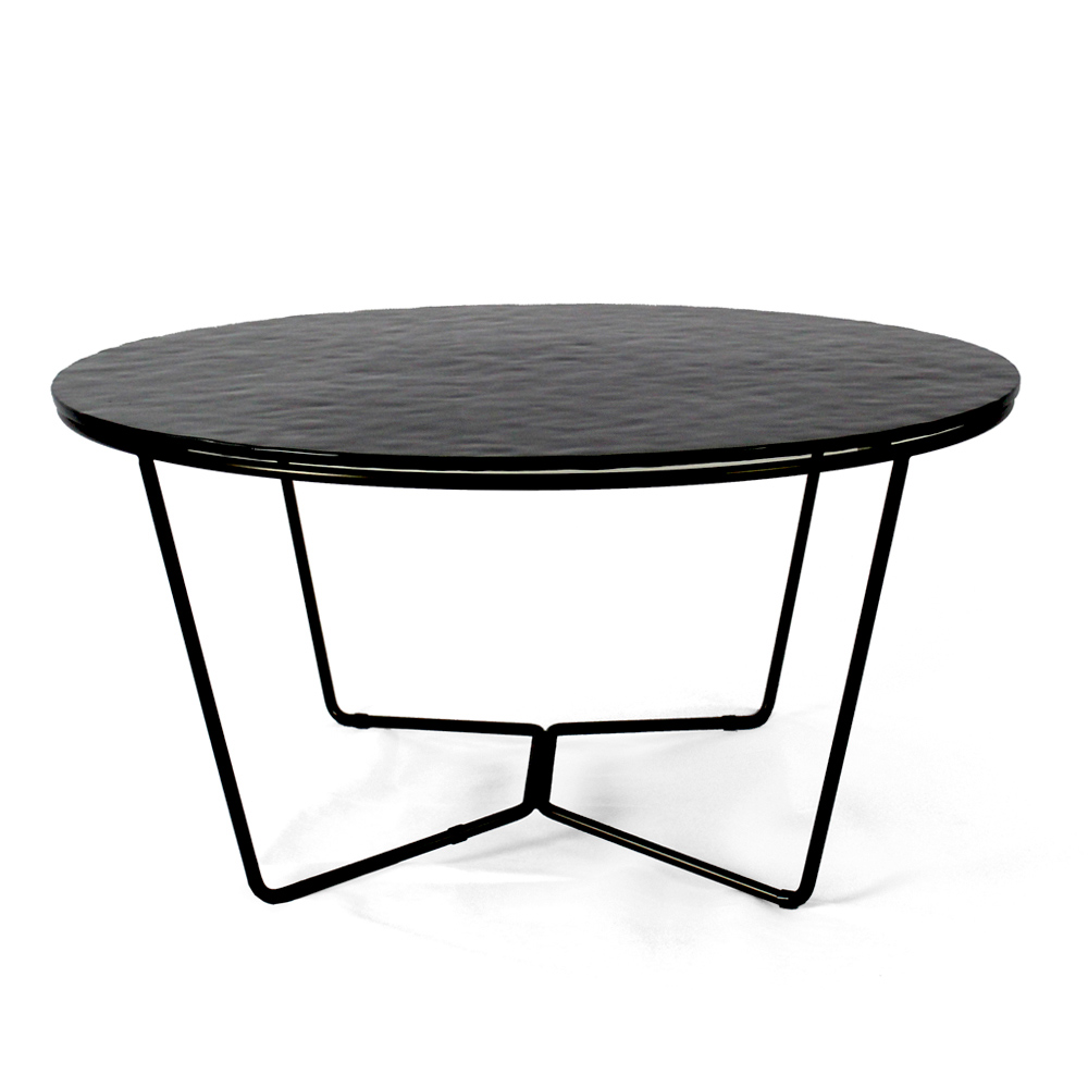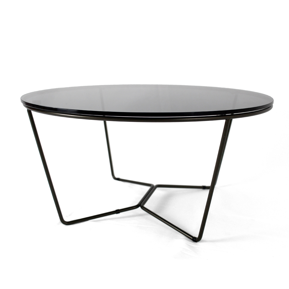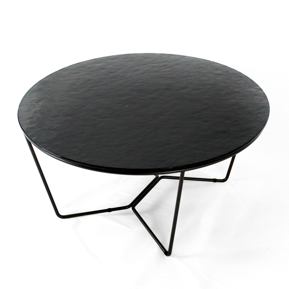 Runder Couchtisch mit lackiertem Stahlsockel und Glasplatte.