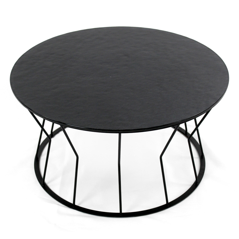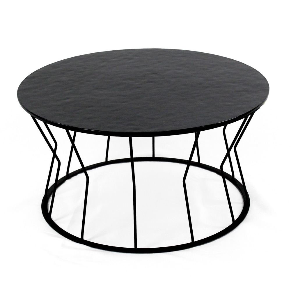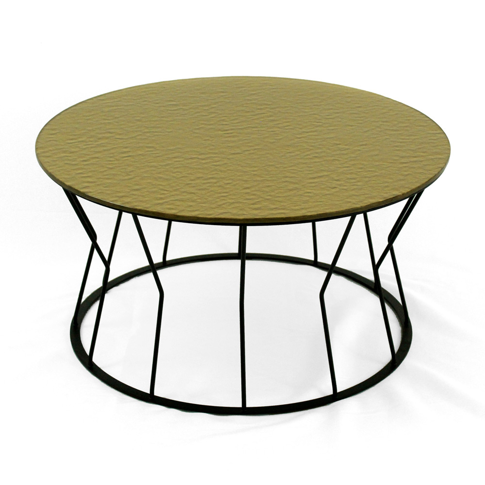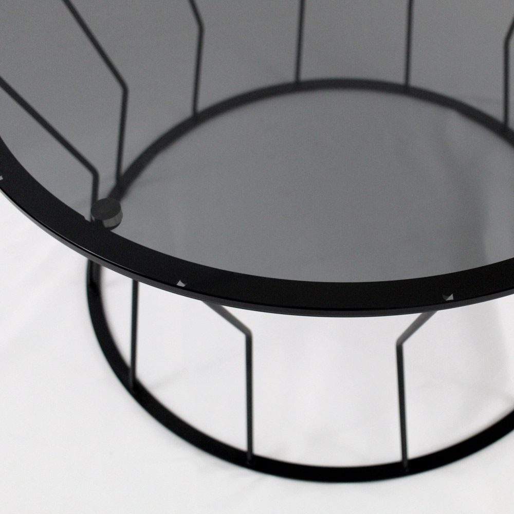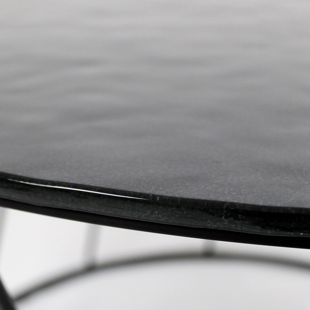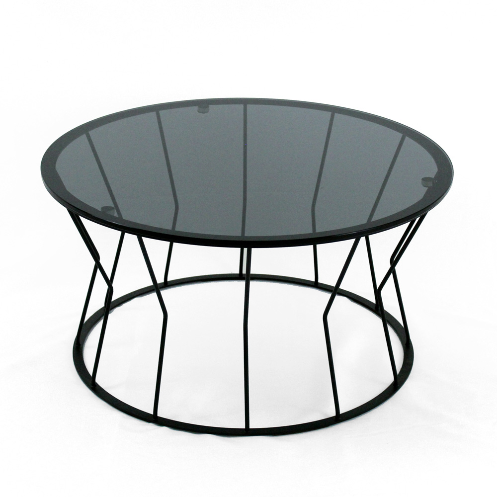 Runder Couchtisch mit lackiertem Stahlsockel und Glasplatte.