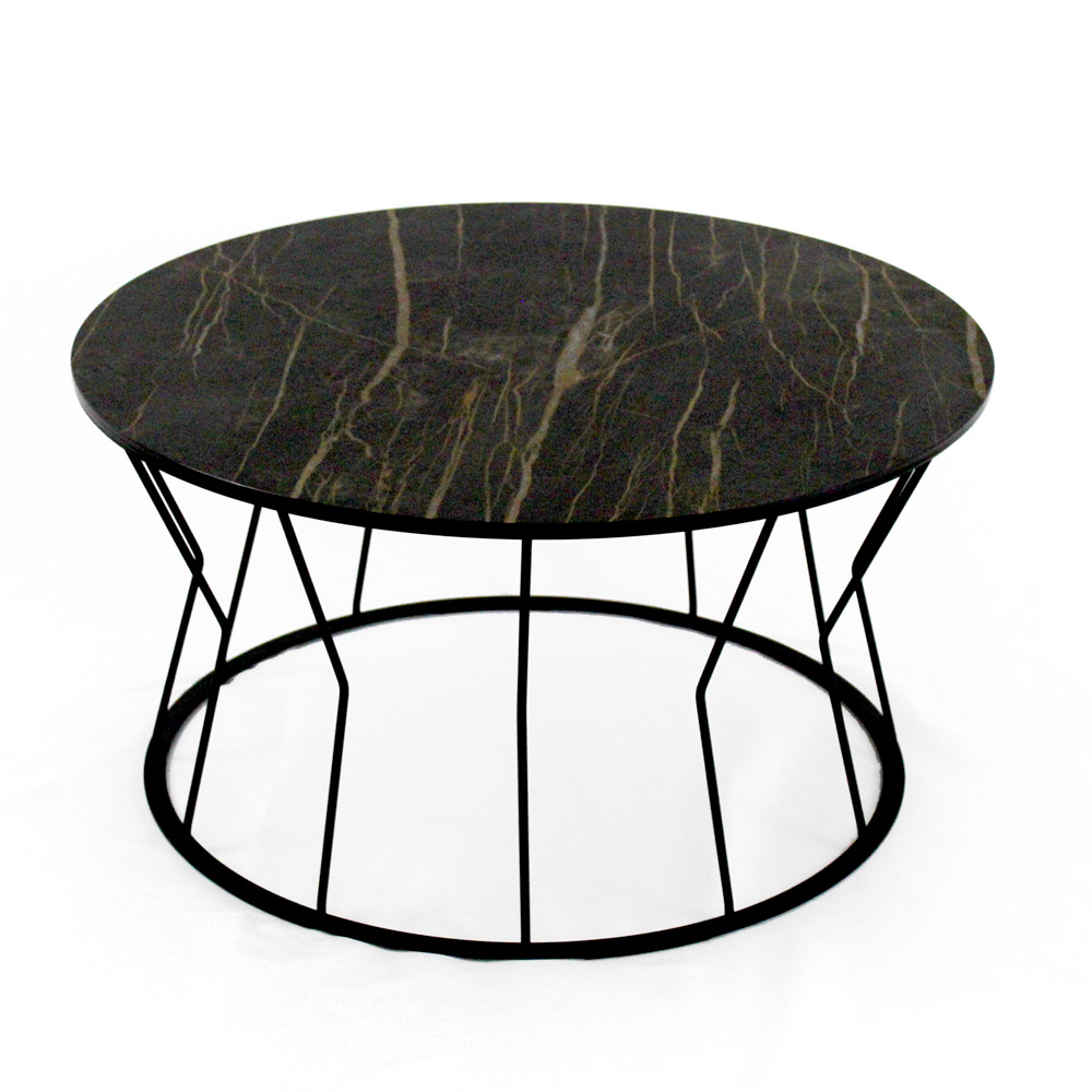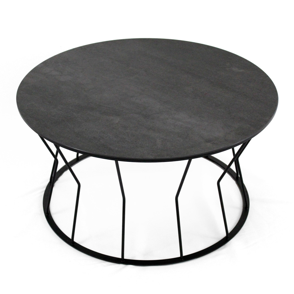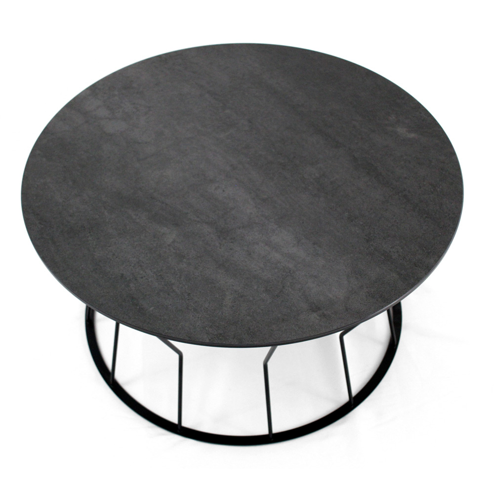 Runder Couchtisch mit lackiertem Stahlsockel und Platte aus Feinsteinzeug.