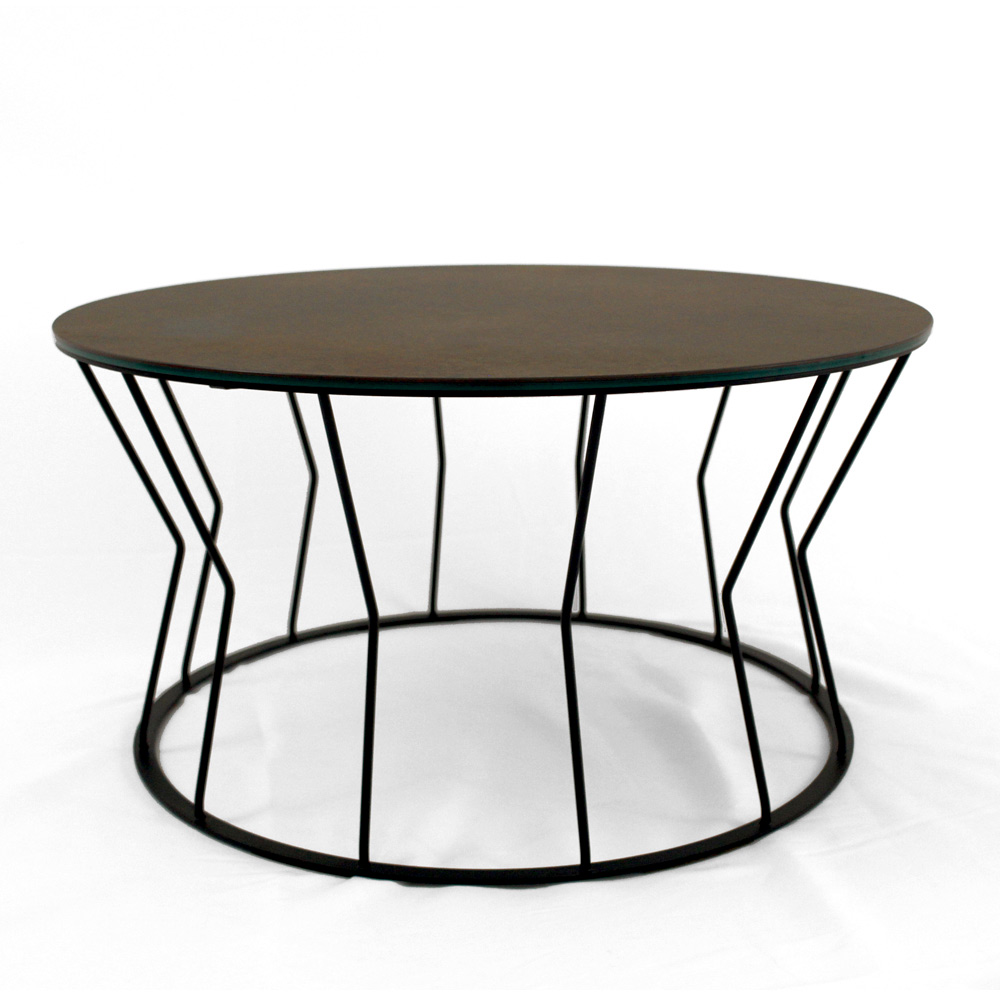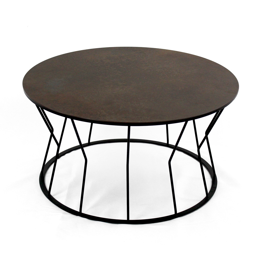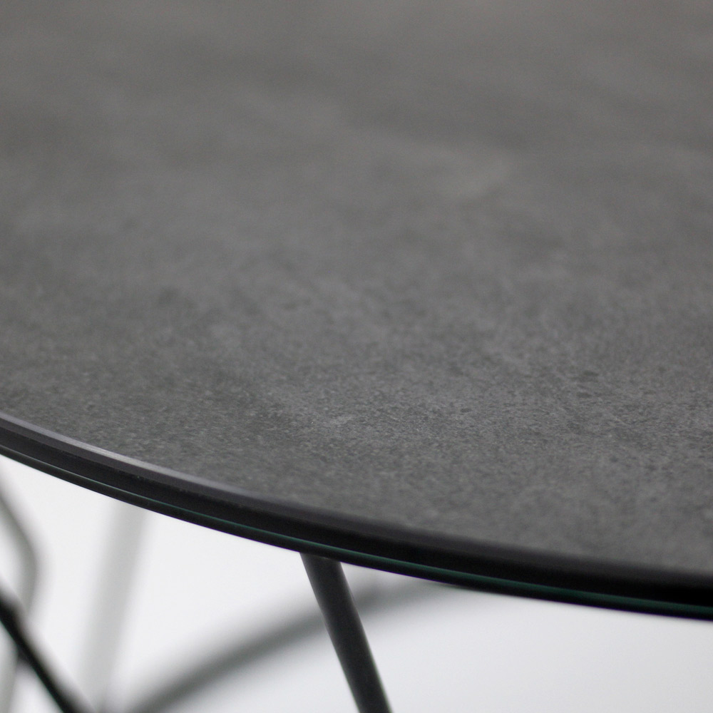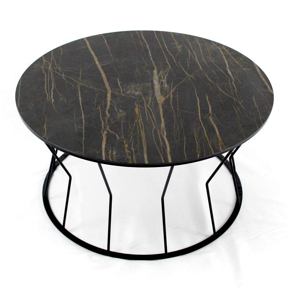 Runder Couchtisch mit lackiertem Stahlsockel und Platte aus Feinsteinzeug.