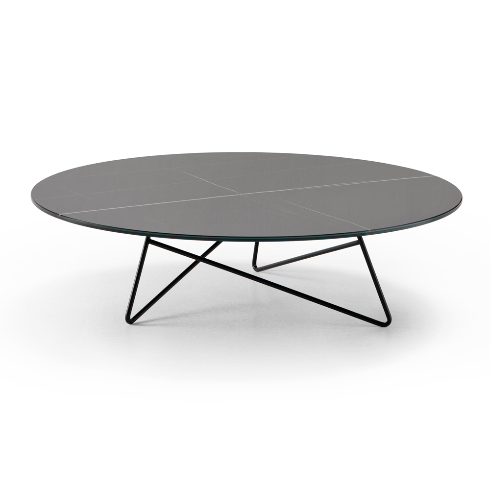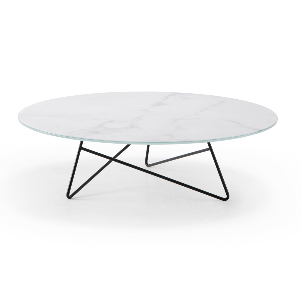 Niedriger Couchtisch mit runder Glasmarmorplatte, Luxusartikel made in Italy.