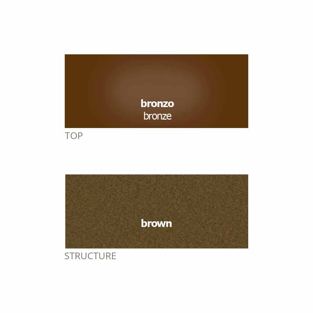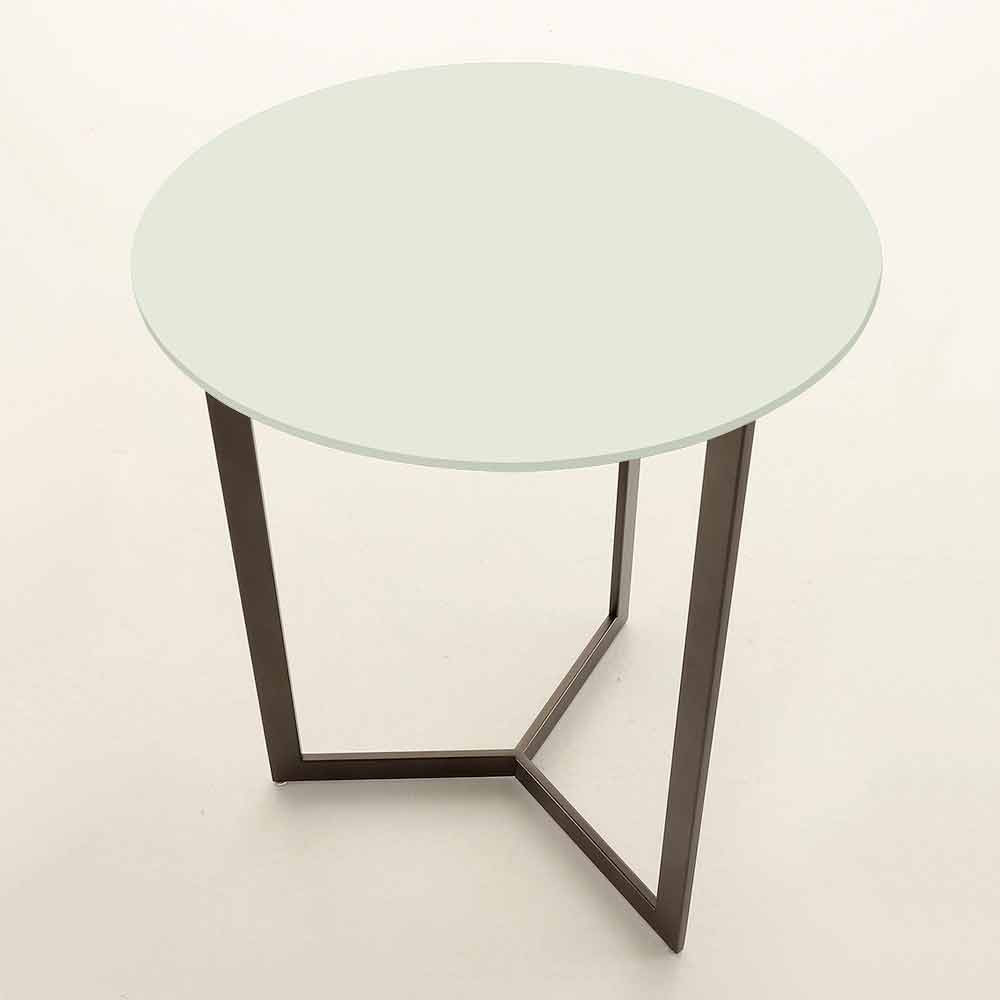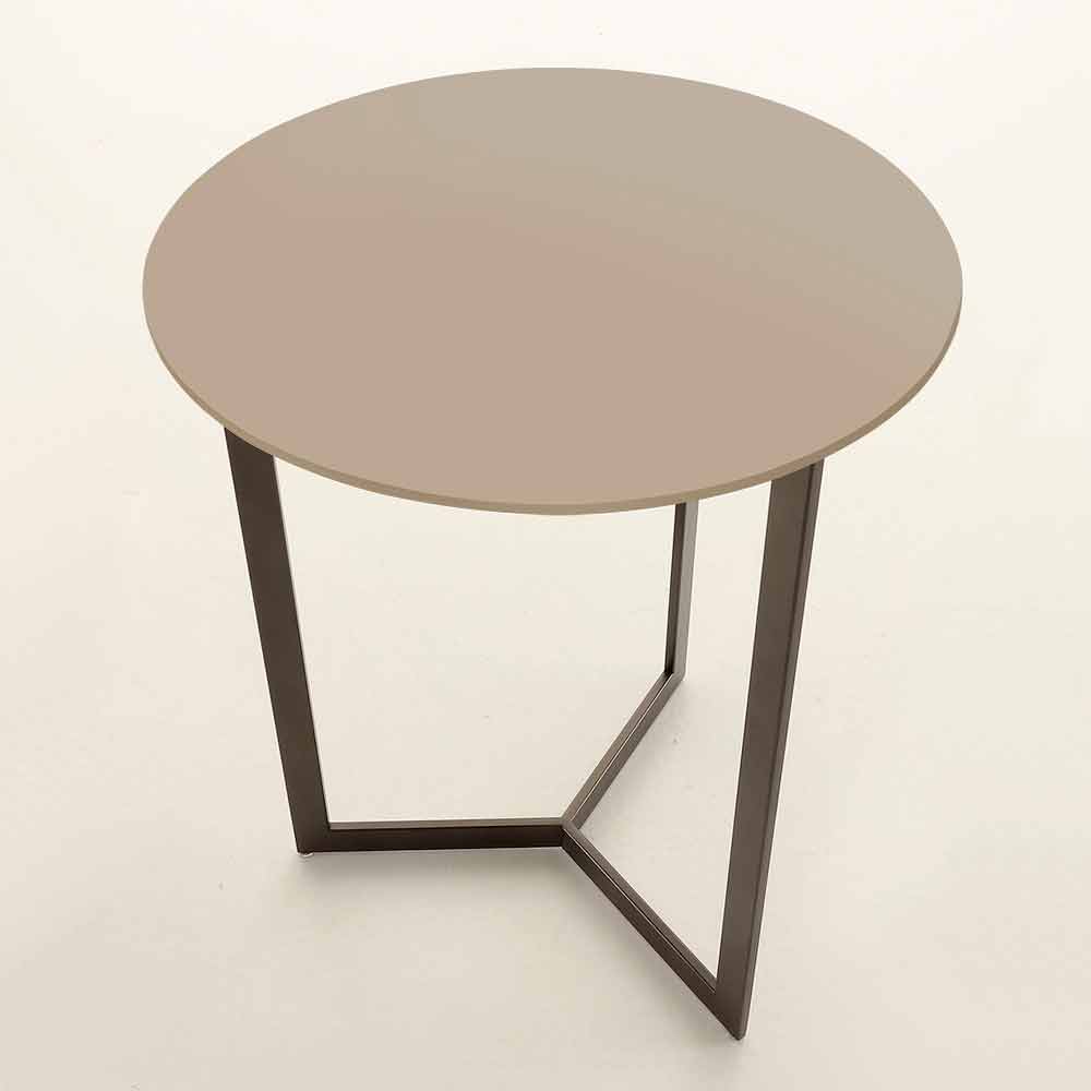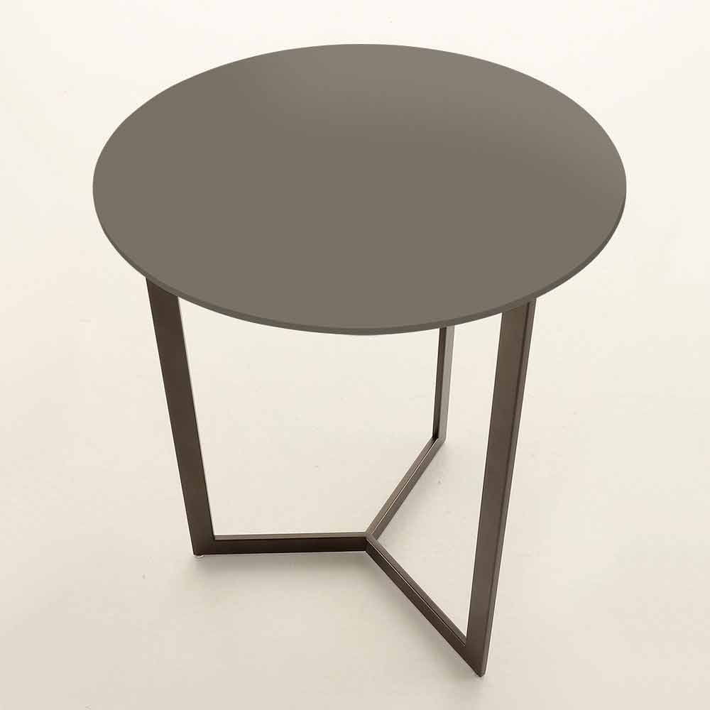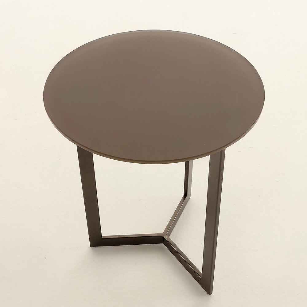 Einfacher und eleganter Couchtisch aus Italien mit runder Platte aus Satinglas gegen Fingerabdruck und Struktur aus braun lackiertem Metall .
