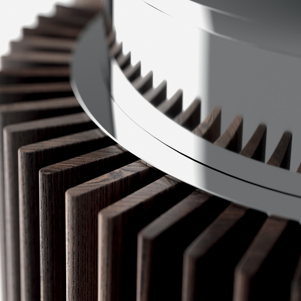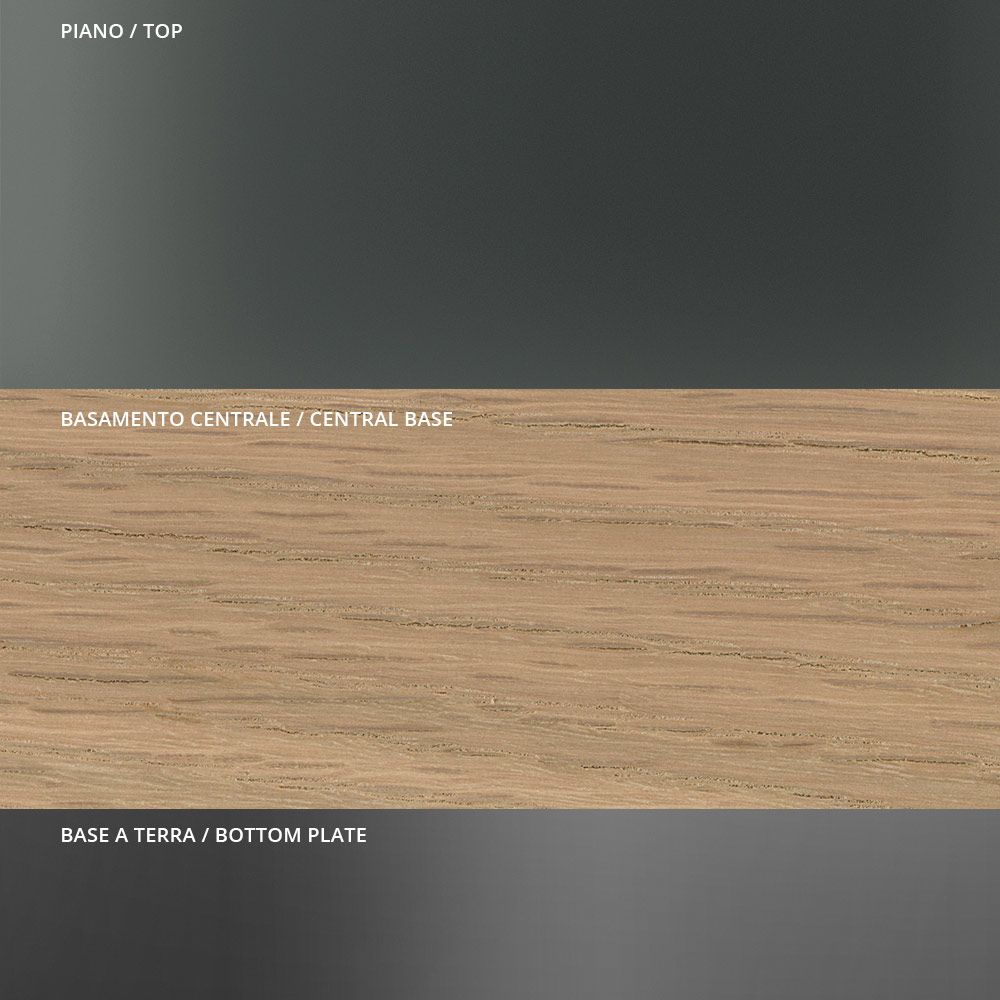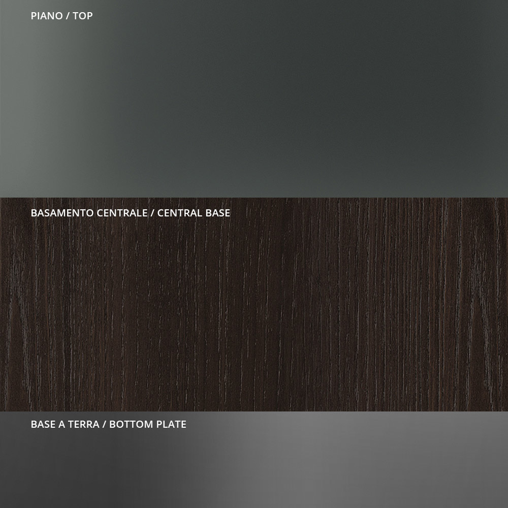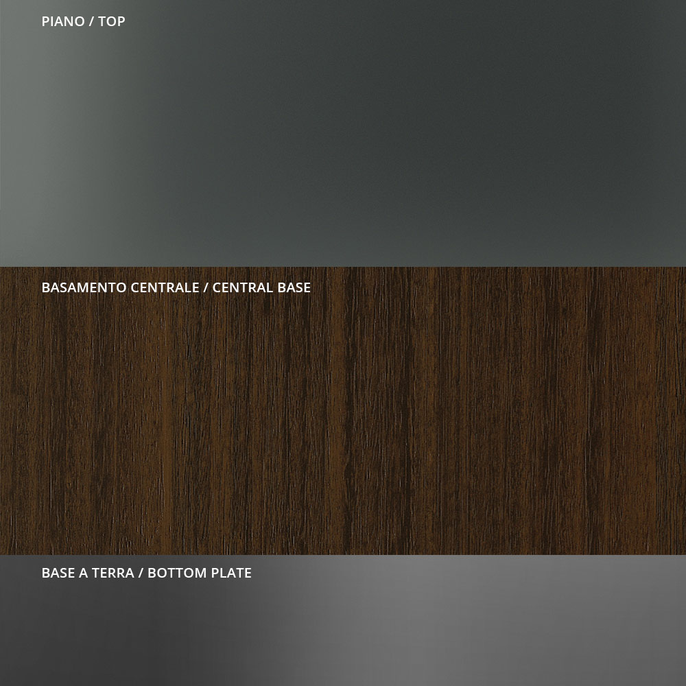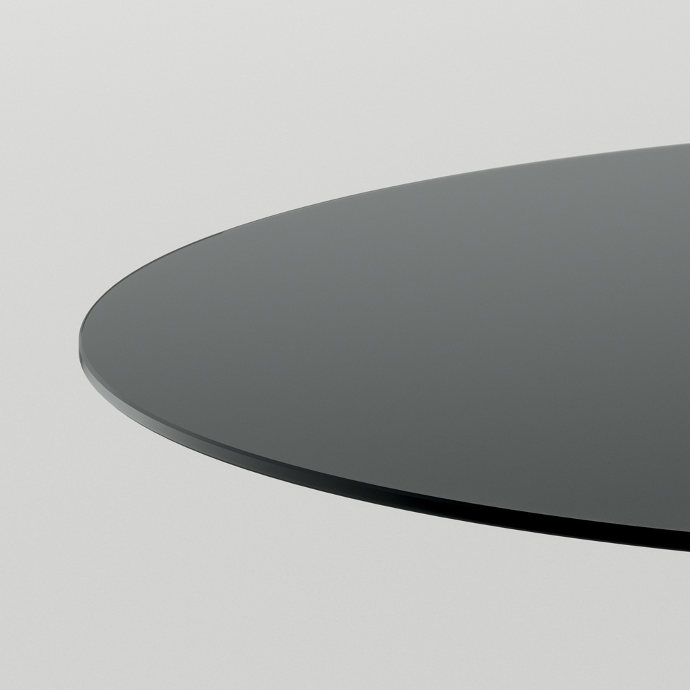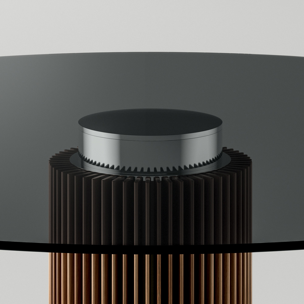 Komplett in Italien hergestellter Esstisch mit runder Platte aus Rauchglas und Untergestell aus Holz- und Metalllatten . Die Stärke seiner Ästhetik ist der architektonische Sockel, der durch Lamellen gekennzeichnet ist, die auf einem Metallsockel mit einer glänzenden metallgrauen Oberfläche ruhen. Die Platte mit ihrer abgerundeten Kante verleiht den Formen Weichheit, während die Metallelemente das Design des Tisches vervollständigen und ihn mit Persönlichkeit und Robustheit bereichern.