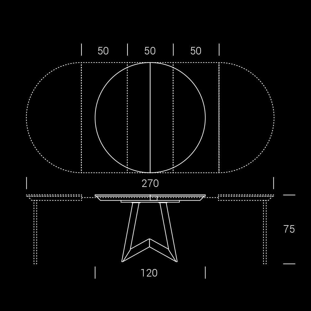 Keramikplatte , die in zwei Halbebenen unterteilt ist, um die 3 externen Verlängerungen aufzunehmen, wodurch die Oberfläche und die Möglichkeiten für Geselligkeit vergrößert werden.