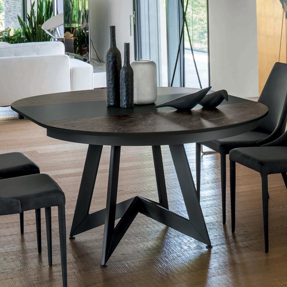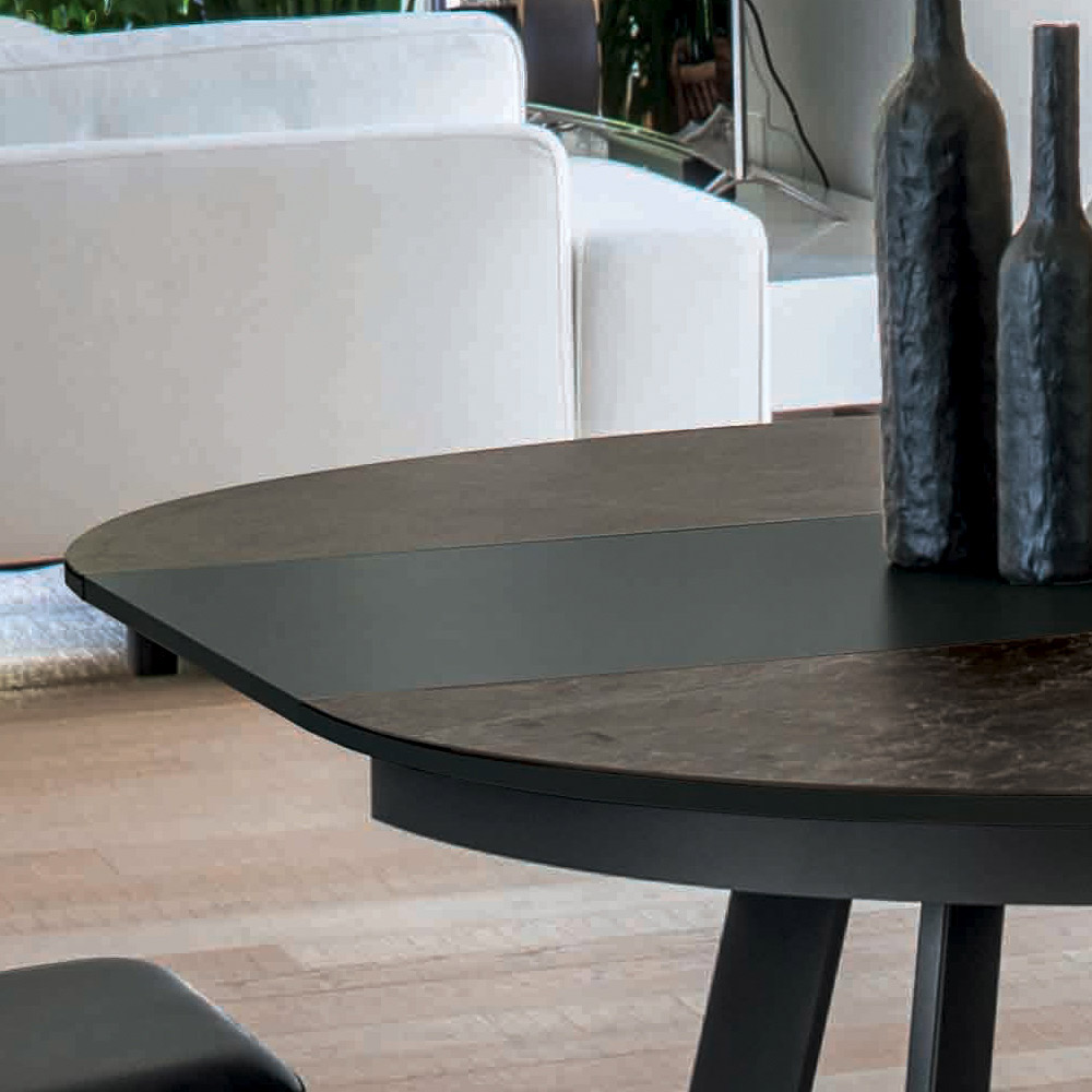 Runder ausziehbarer Esstisch aus Keramik und lackiertem Metall Made in Italy.