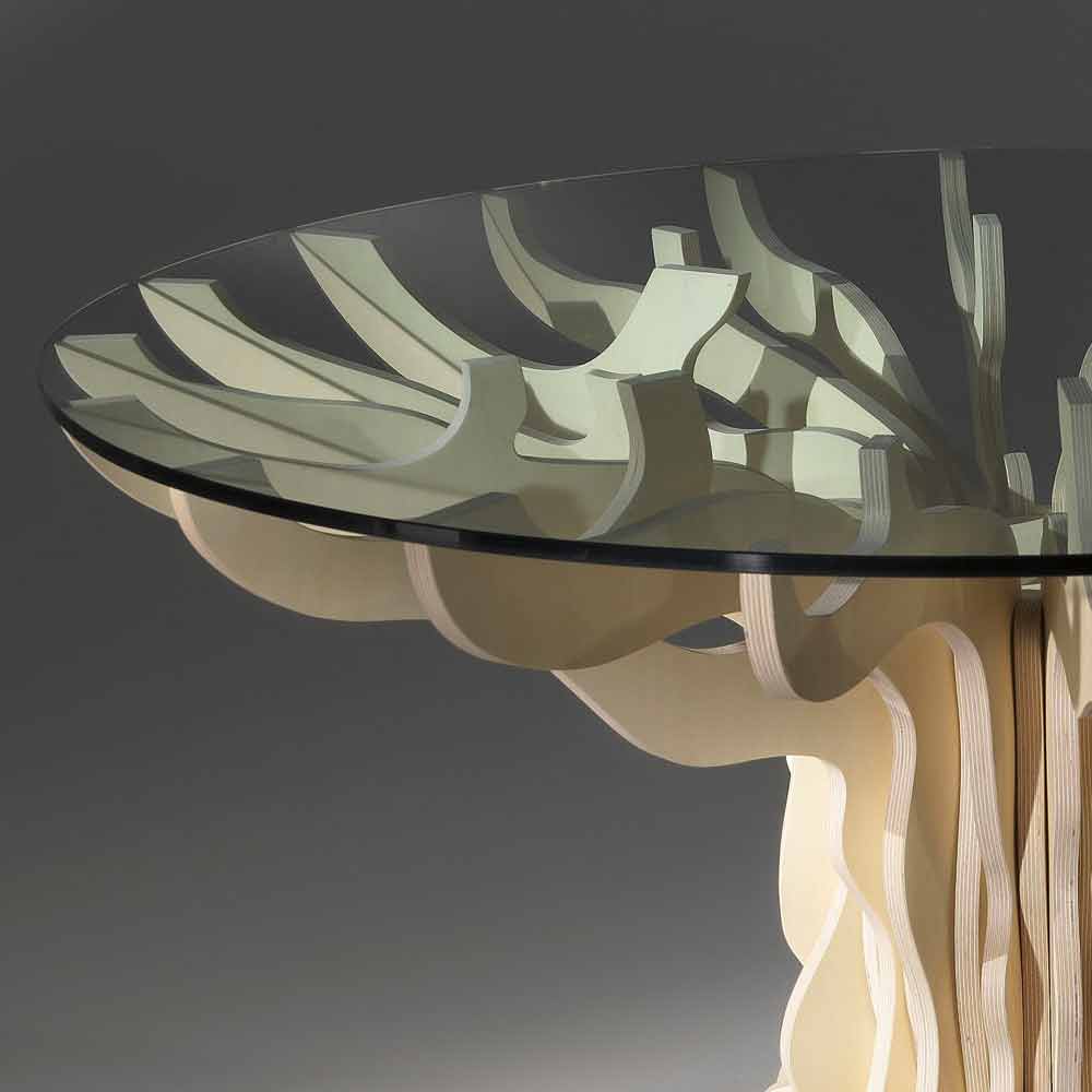 Runder Couch und Esstisch aus natürlichen Birkenholz und Glastischplatte aus Kristallglas Cassia - made in Italy
