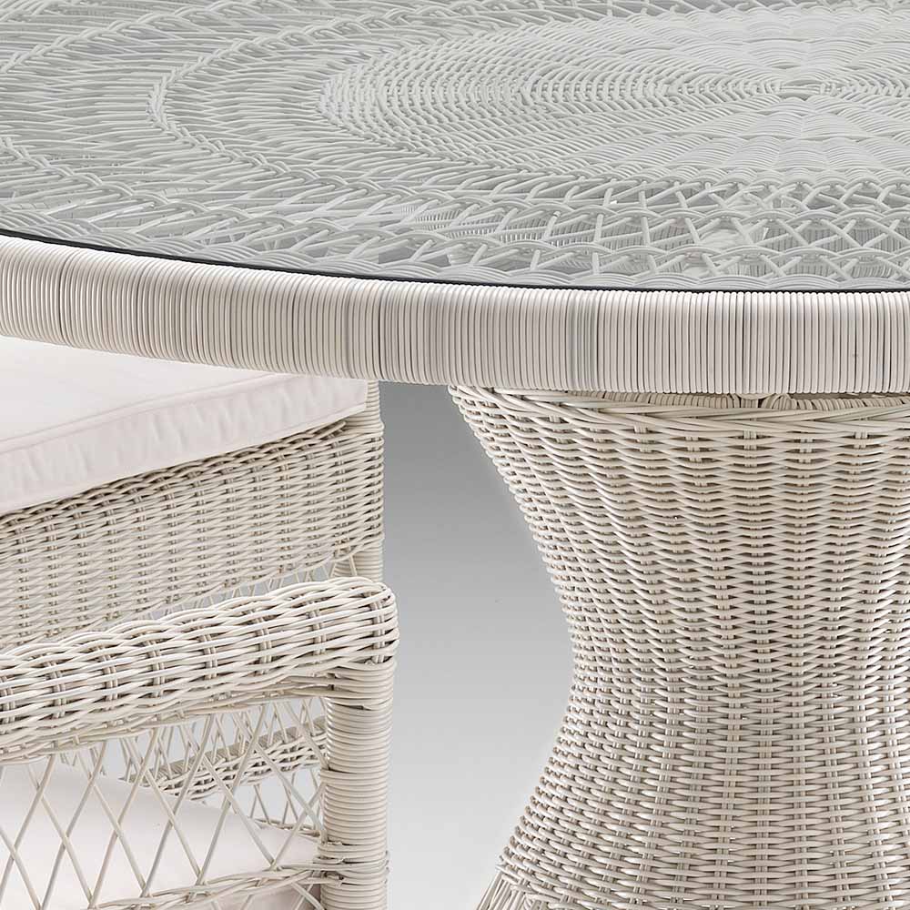 Der Gigi runder Esstisch für den Außenbereich hat eine Struktur mit einem Gestell aus pulverbeschichtetem Aluminium, auf dem von den erfahrensten Handwerkern der hochwertigen Rehau-Marke Polyrattan-Faser mit einer Stärke von 3 mm handgeflochten wird. Zusätzlich ist der Tisch mit einer 8 mm starken Glasplatte ausgestattet, die die handgeflochtene Rosette durchscheinen lässt.