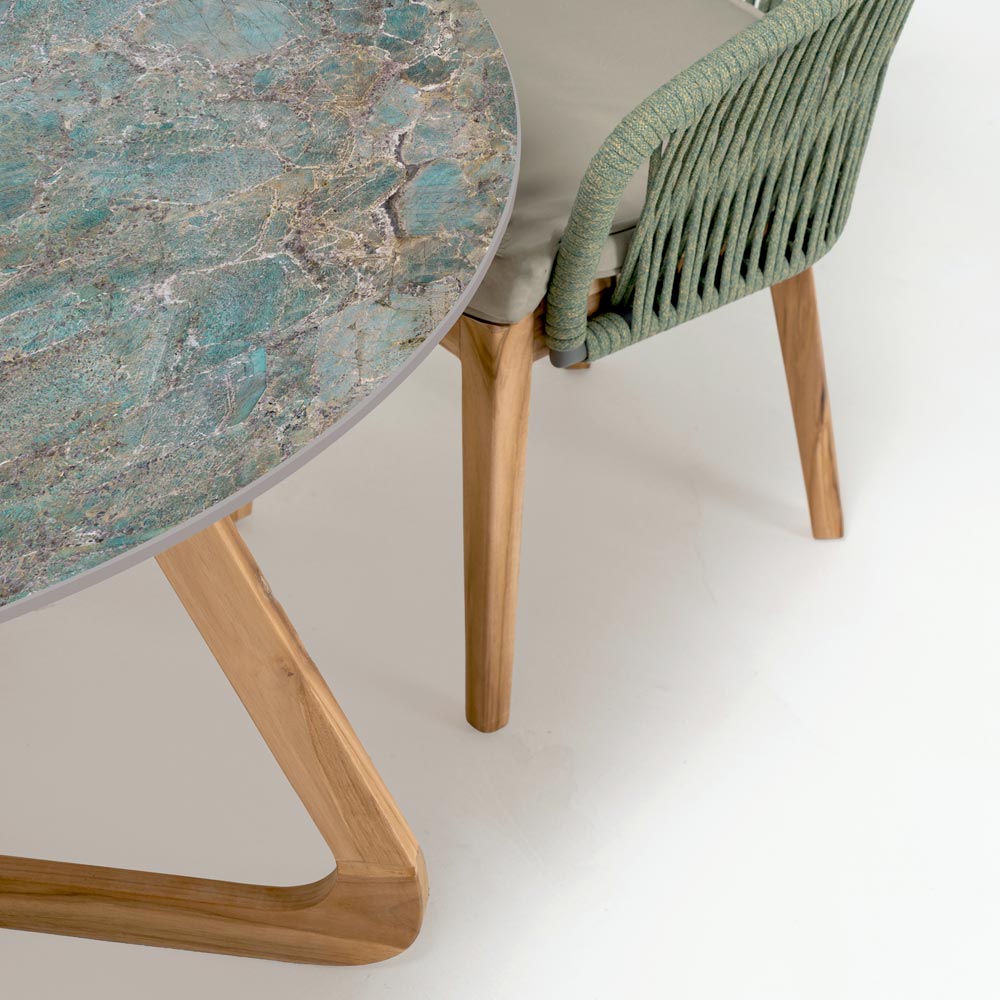 Gartentisch mit einer Basis aus massivem natürlichem Teakholz (35 mm dick), einer Infinity-Steinzeugkeramikplatte (12 mm dick) mit glänzendem Santos- Finish und einem Untergestell aus Okumé-Bootssperrholz , vollständig in Italien hergestellt.