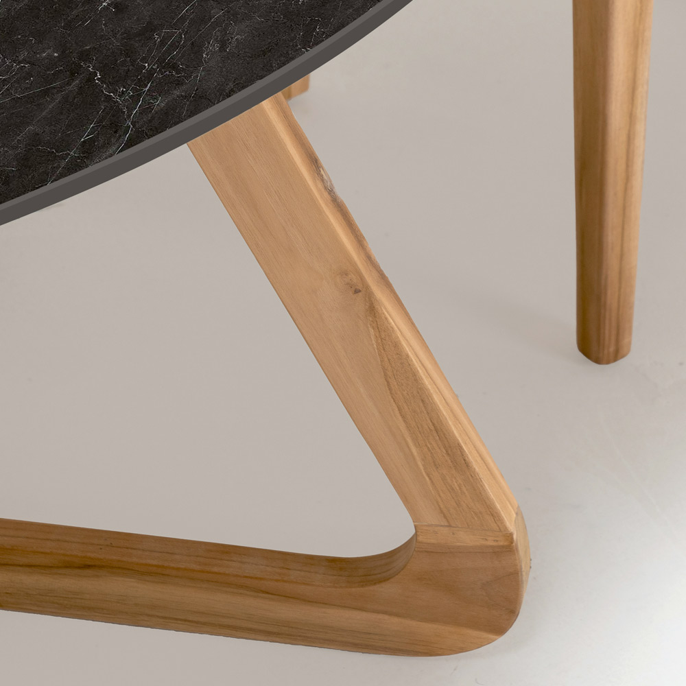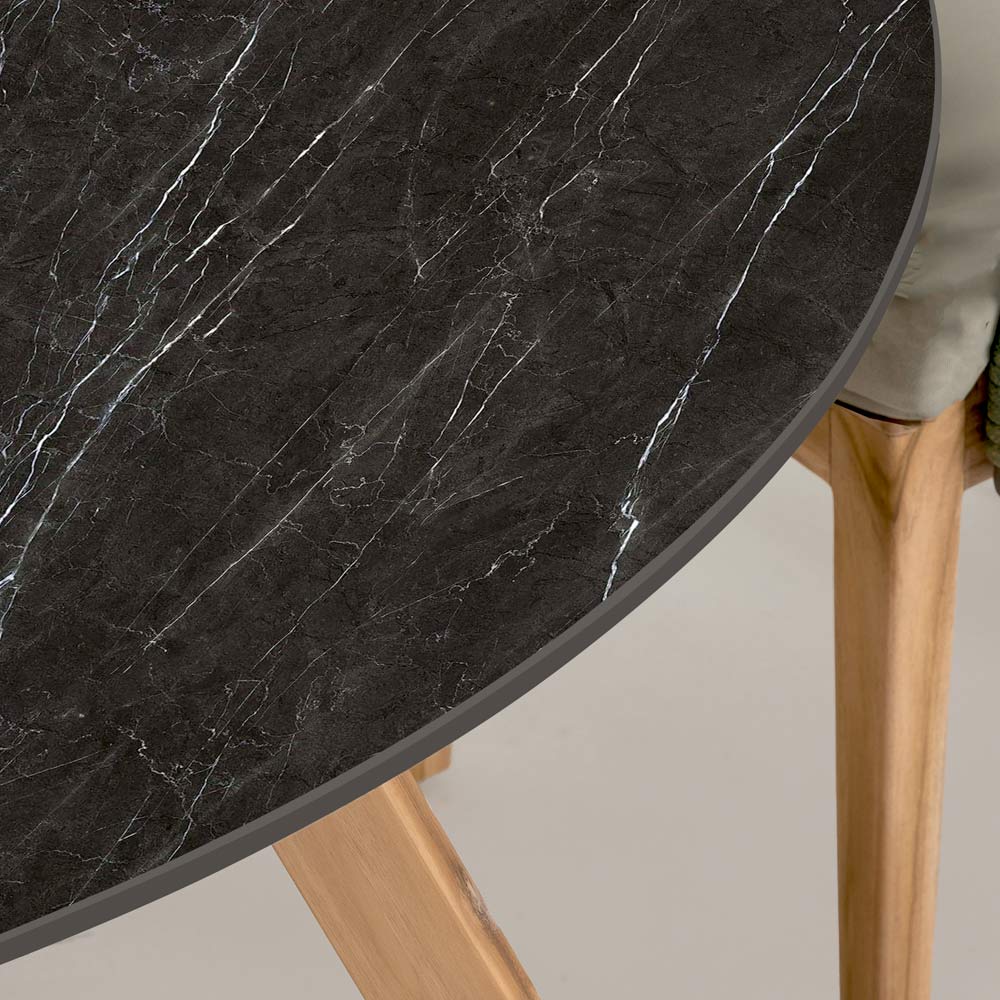 Tisch für den Außenbereich mit einer Basis aus massivem natürlichem Teakholz (35 mm dick), einer Infinity-Platte aus Steinzeugkeramik (12 mm dick) mit mattem Nero Marquinia -Finish und einem Untergestell aus Okumé-Bootssperrholz , vollständig in Italien hergestellt.