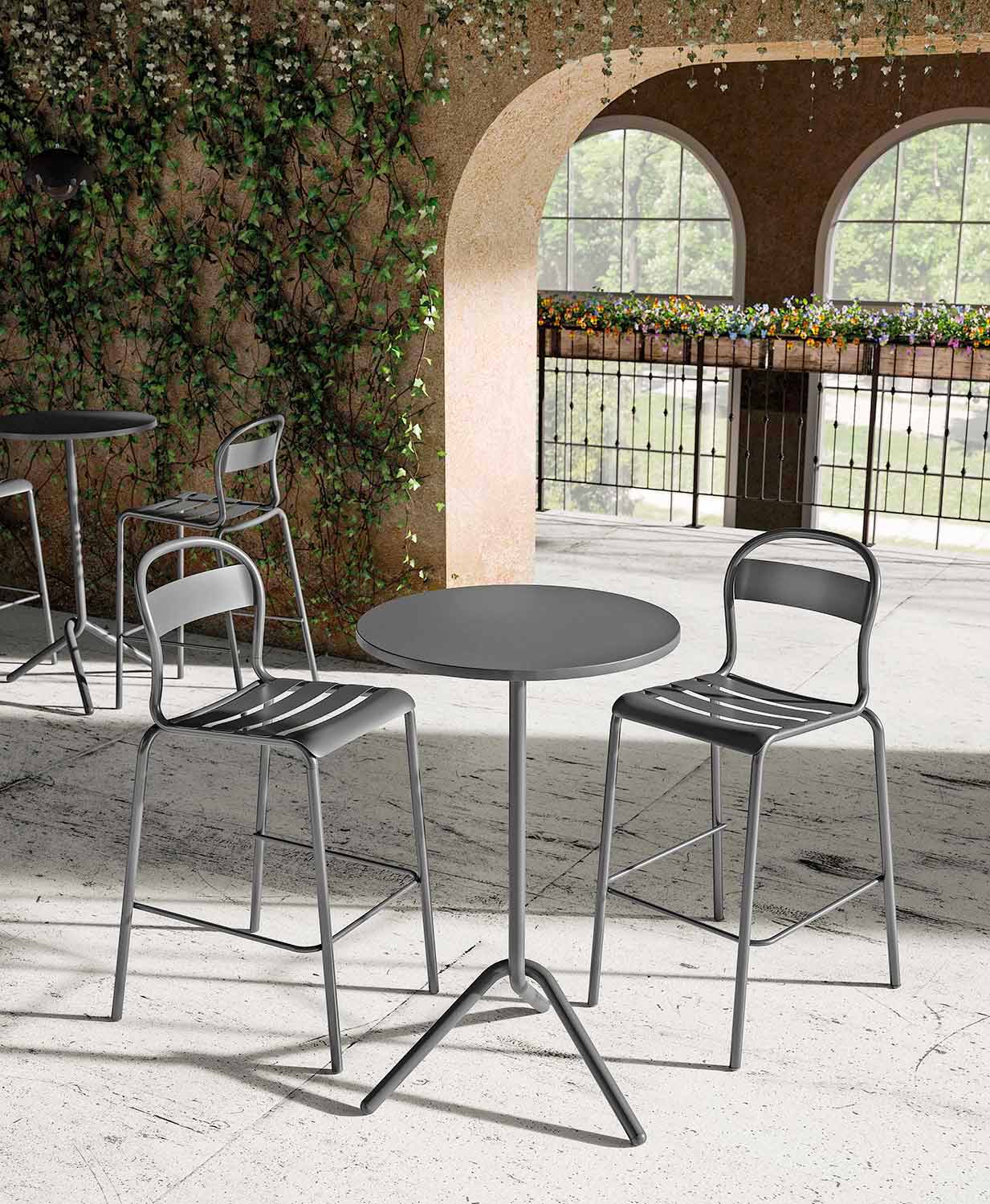Runder Hochtisch im Freien aus Metall und stapelbarem und faltbarem Blech Made in Italy.