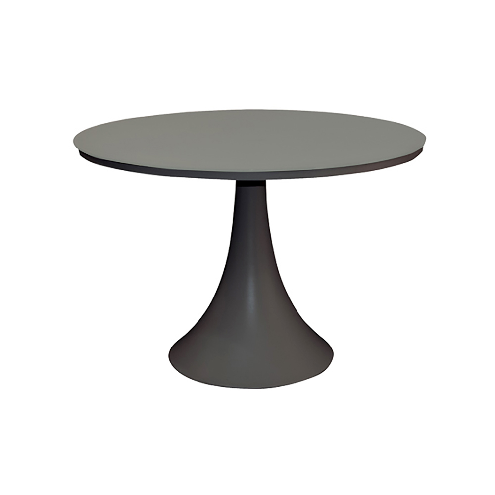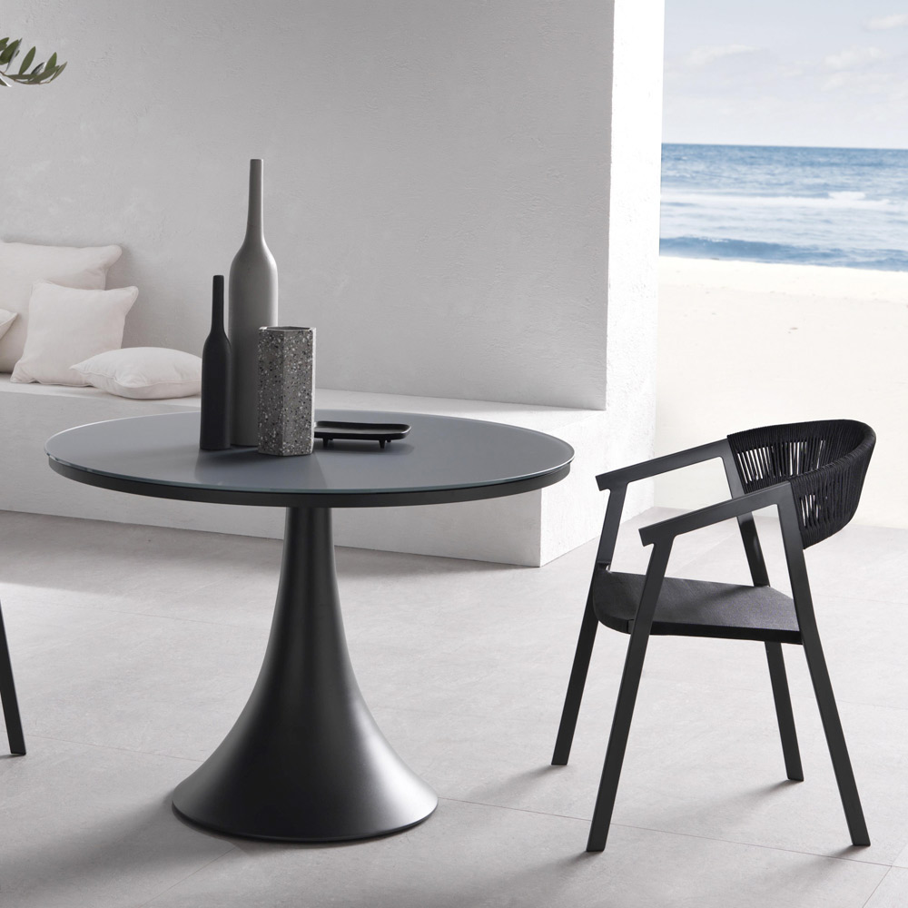 Runder Gartentisch mit epoxidpulverbeschichteter Aluminiumstruktur und rückseitig lackierter Glasplatte